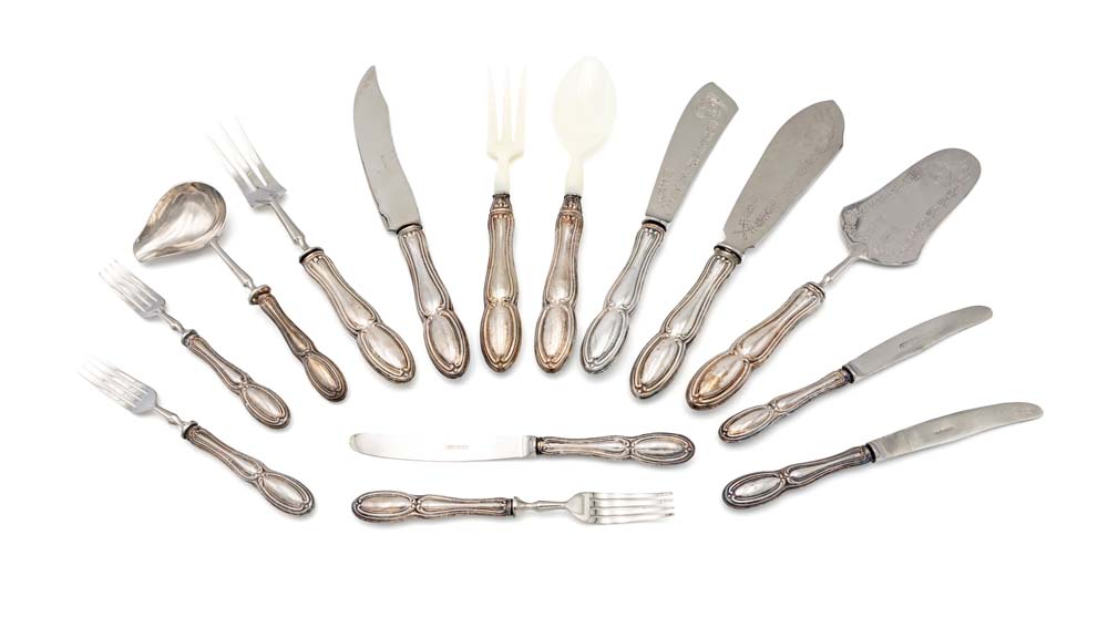 Servizio da dessert e posate da portata in lamina d'argento sbalzata dodici forchette (cm 16,4) ed altrettanti coltelli (cm 19); due coltelli diversi con lame incise (cm 25,5 e cm 28), paletta (cm 28); forchetta e coltello da arrosto (cm 24 e cm 27,5); mestolo da salsa (cm 18,5) e due posate da insalata (cm 24,5)