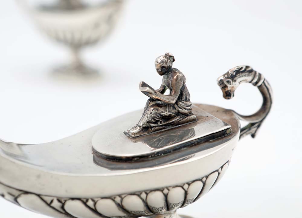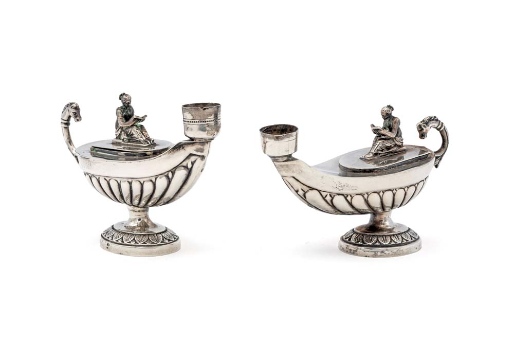 Coppia di piccole lucerne in argento, XX secolo dalla caratteristica forma desunta dall'antico, caratterizzate da figura scultorea rappresentante una vestale in lettura posta sulla sommità del coperchio; corpo baccellato, manico arcuato con estremità in forma di testa equina, piede con profilo a palmette. Difetti (una con portacandela ammaccato) cm 9,7x14x6 e cm 8x14x6 - peso complessivo gr. 420