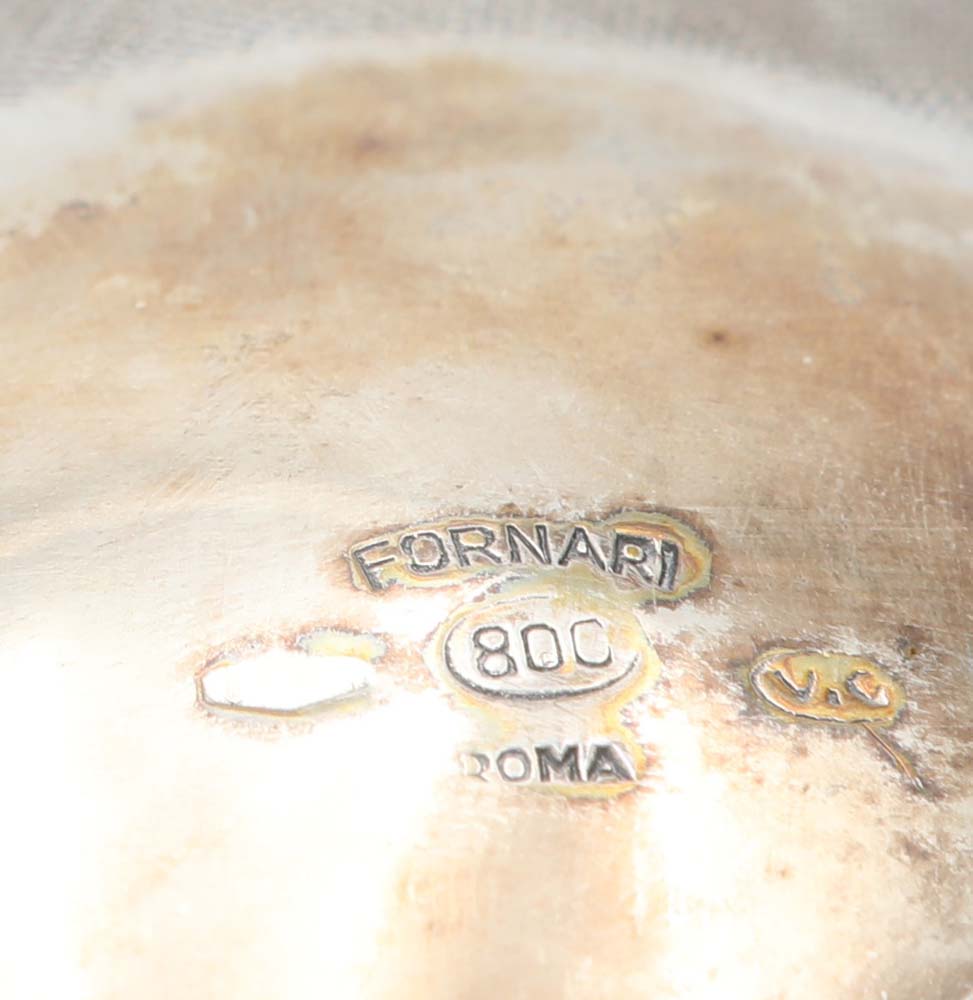 Servizio da tè e caffè composto da quattro elementi in argento 800/000, Fornari, Roma teiera e caffettiera dalle analoghe caratteristiche, si differenziano unicamente nell'apertura del coperchio (altezza cm 21 e cm 23); lattiera ad anfora con versatoio svasato (cm altezza cm 12,5); zuccheriera biansata con coperchio (cm 12x14,5x9) peso complessivo gr. 2410