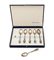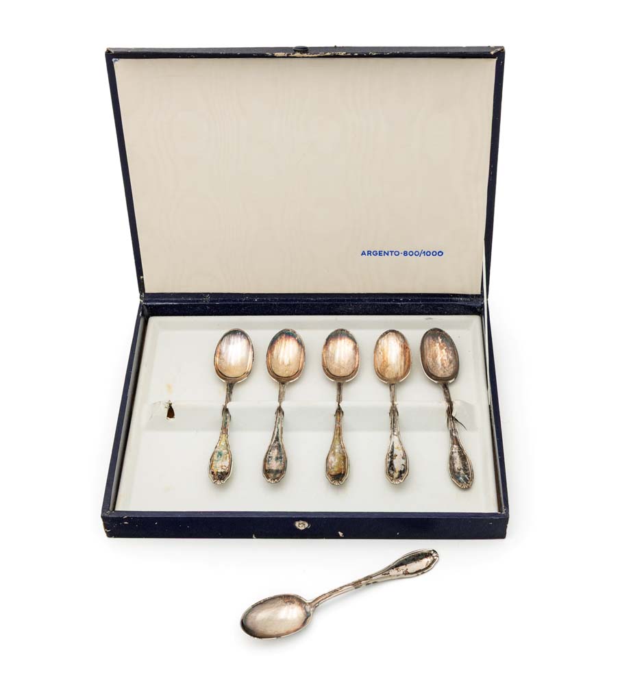 Sei cucchiaini da tè in argento 800/000, entro scatola impugnatura con vertice allungato centrato da una palmetta cm 12 - peso complessivo gr. - scatola cm 2,5x23x17