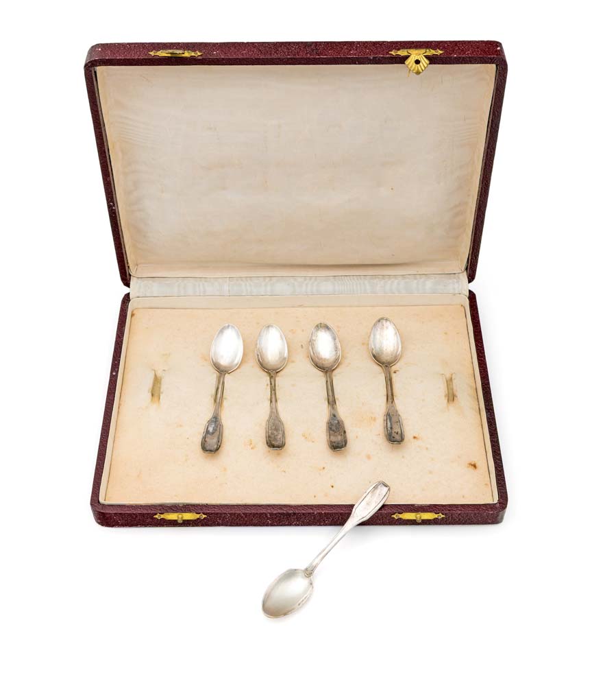 Lotto 668 | Cinque cucchiaini da caffè con impugnatura squadrata, entro scatola originale...