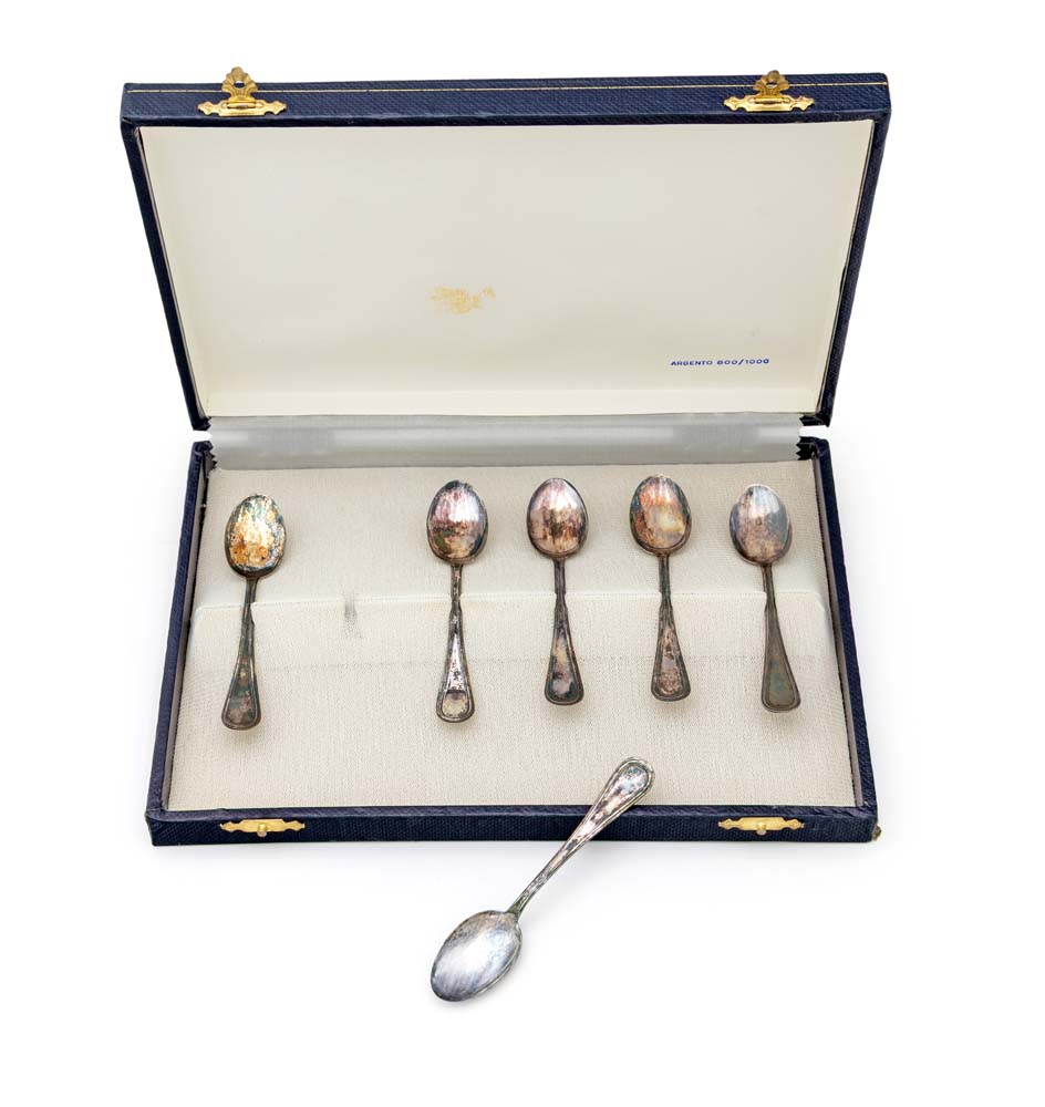 Sei cucchiaini da caffè in argento 800/000 stile inglese, entro scatola cm 9,7 - peso complessivo gr. - scatola cm 3x22x16