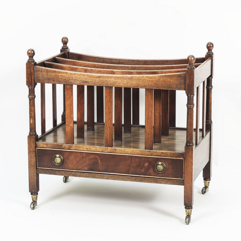 PORTARIVISTE IN ROVERE E PIUMA DI MOGANO Inghilterra, XX secolo un cassetto nella fascia, piedini con rotelle h cm 54x55,5x35,5 OAK AND MAHOGANY MAGAZINE RACK