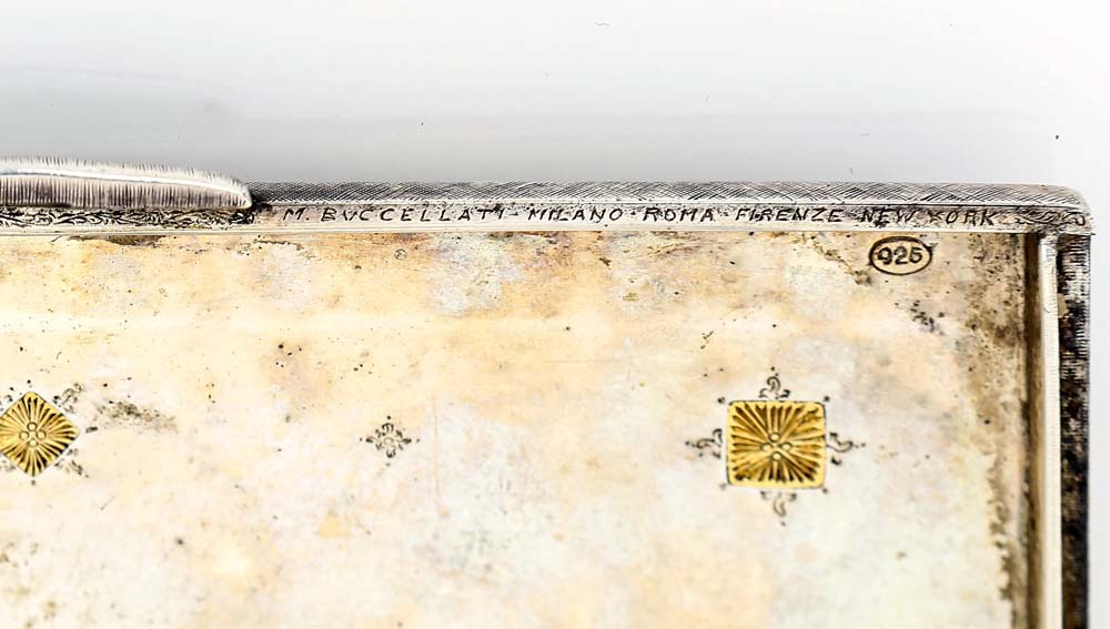 Scatola portasigarette in argento 925/000 superficie satinata con stelle dorate sul coperchio, visibili anche al verso; all'interno piccoli motivi incisi simmetricamente sparsi cm 1x10x8 - gr. 162