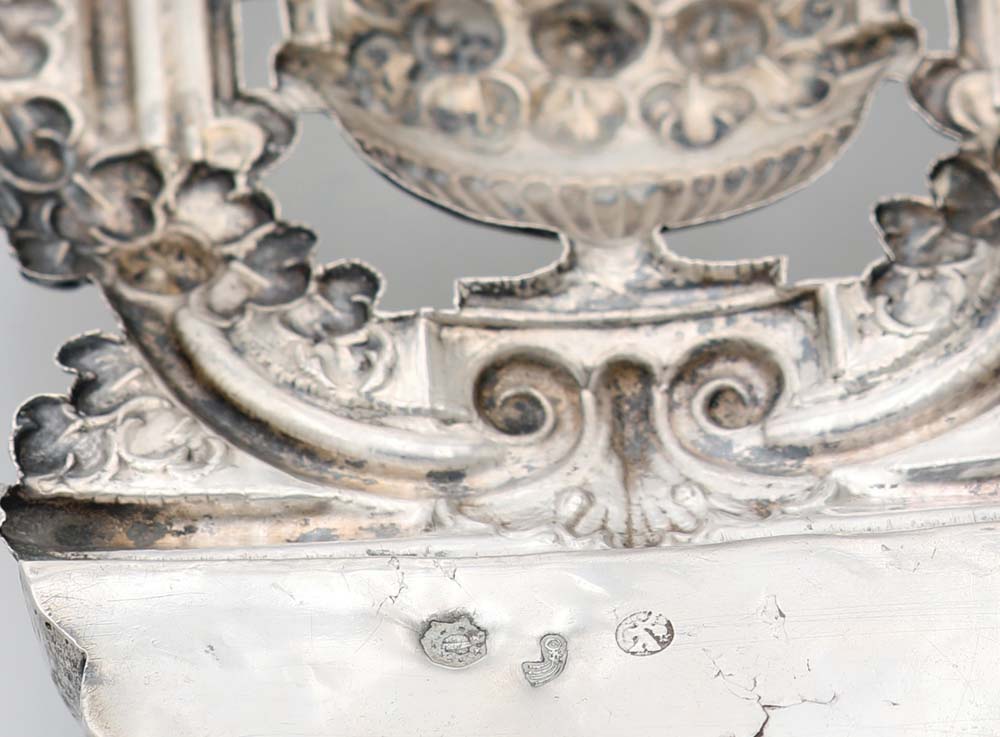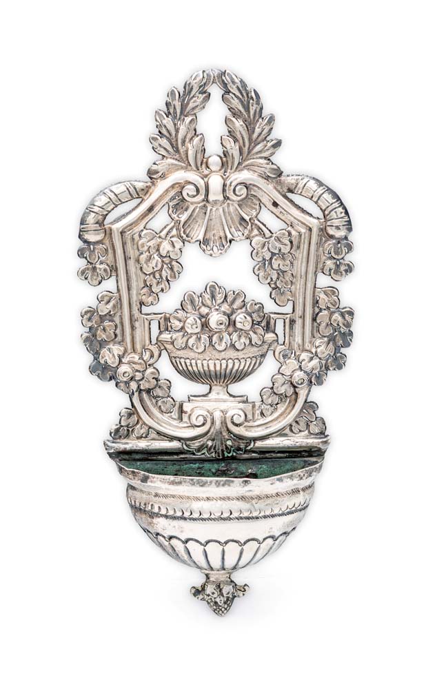 Piccola acquasantiera in lamina d'argento sbalzata, regno lombardo veneto, Venezia, seconda metà del XIX secolo vaschetta dominata da una coppa ricolma di fiori incorniciata da un cartiglio con ghirlande fiorite e corona d'alloro posta sulla sommità cm 19,5x9,5x2,5 - gr. 54