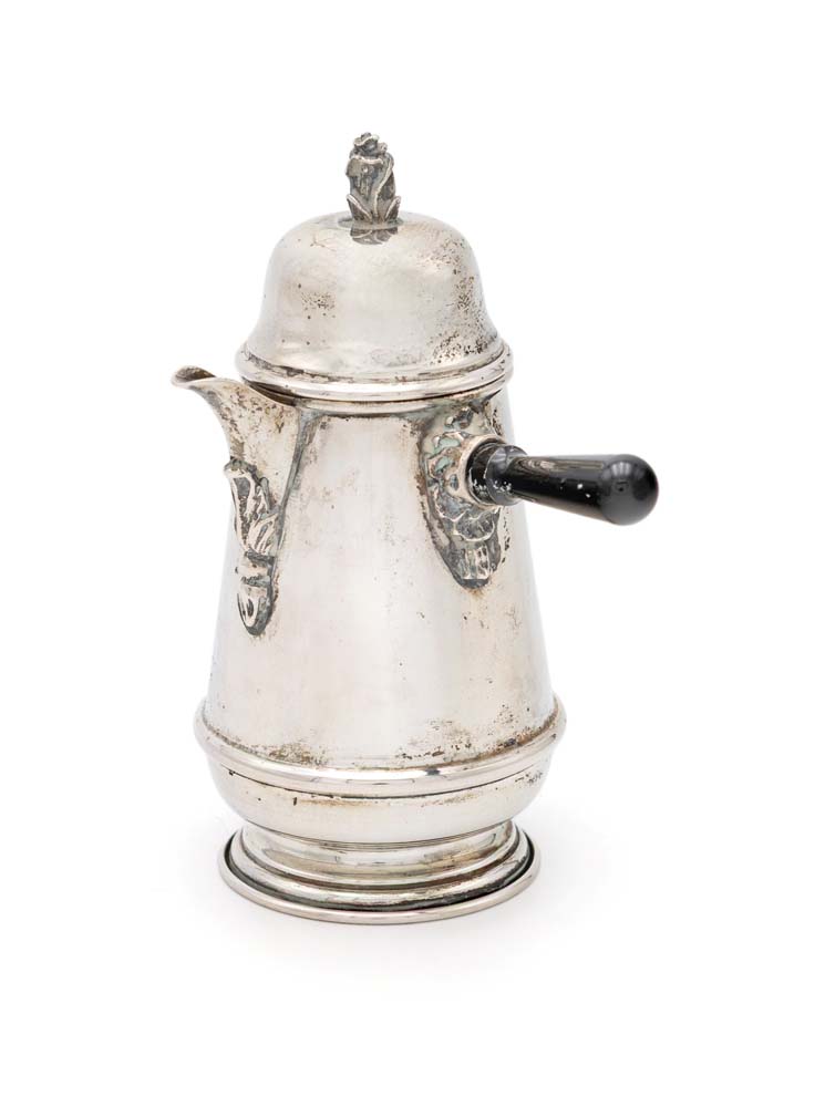 Egoiste in argento corpo a tronco di cono su piede circolare gradinato, versatoio a mensola, coperchio a cupolino sormontato da un bocciolo; manico traverso in legno ebanizzato altezza cm 9 - gr. 36