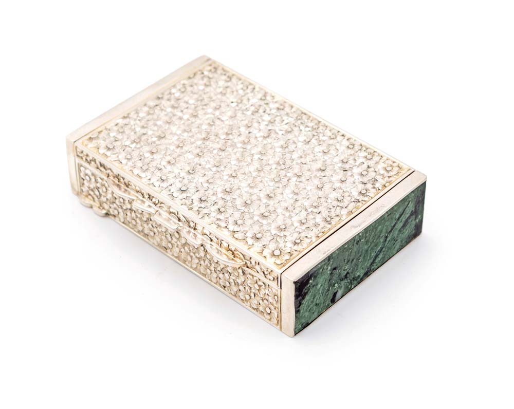 Piccola scatola in argento interamente cesellato a corolle, interno dorato e inserti laterali in pietra dura cm 2x8,5x5,5 - peso lordo gr. 102
