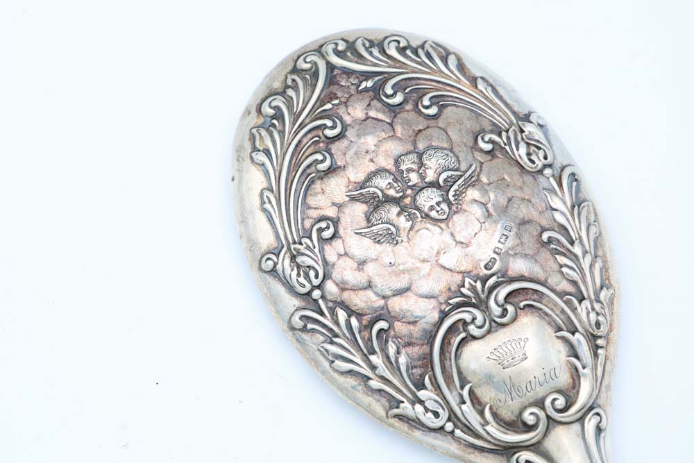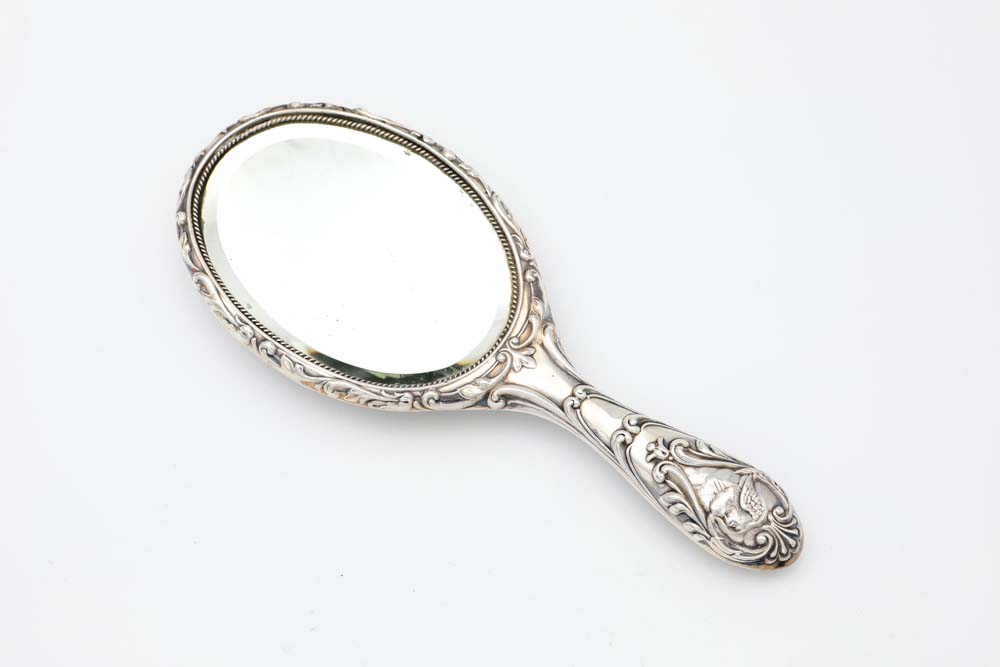 Specchio da toletta in lamina d'argento sbalzato, Birmingham, 1900ata, caratterizzato da teste di cherubino racchiuse da elementi vegetali; corona comitale e intestazione a "Maria" incisi entro un cartiglio. Entro scatola  cm 26x11 - scatola cm 4x32x16