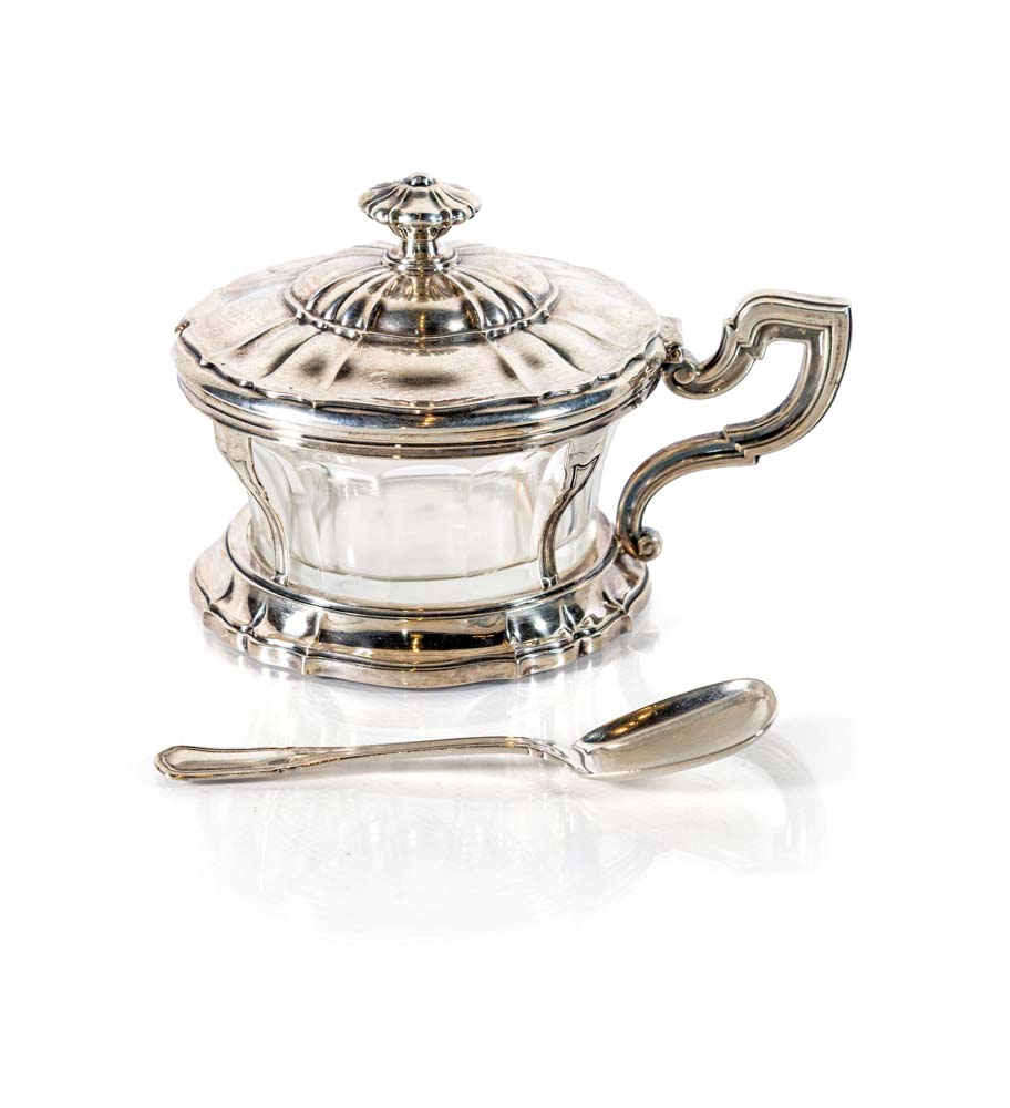 Portaformaggio circolare in argento 800/000 e vetro con cucchiaino coperchio...