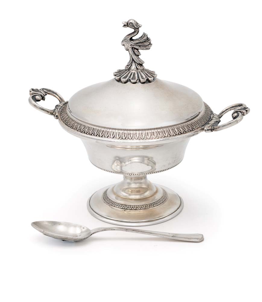 Zuccheriera biansata con coperchio e cucchiaio cm 12,5x14,5x10 - cucchiaino cm 10,7 - peso complessivo gr. 240