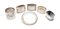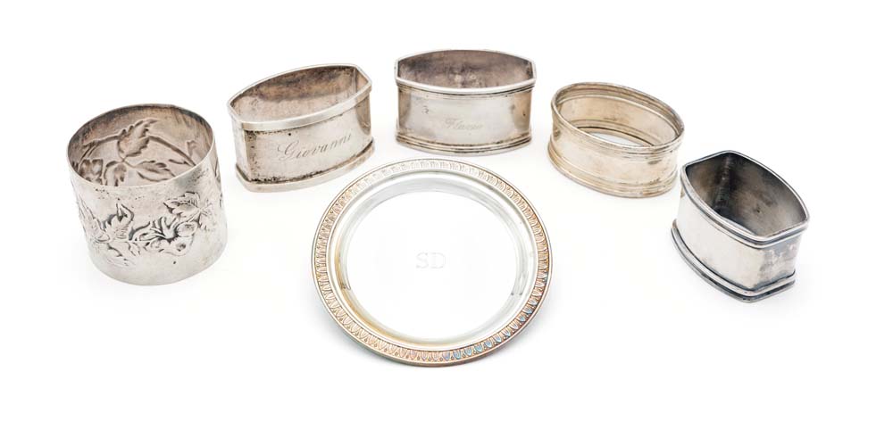 Lotto composto da cinque portatovagliolo ed un piattino con iniziali incise tre portatovagliolo a barilotto, uno ovale ed uno ad anello con tralcio fiorito dell'argentiere Brandimarte; il piattino con profilo a palmette ed iniziali SD peso complessivo gr. 168