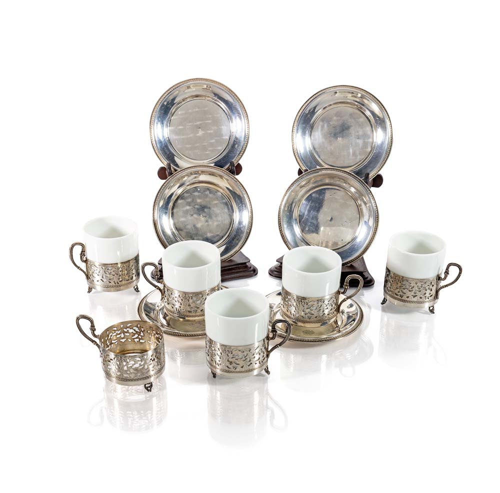 Lotto 713 | Sei porta tazzina con piattino in argento 800/000 con cinque tazzine...