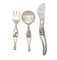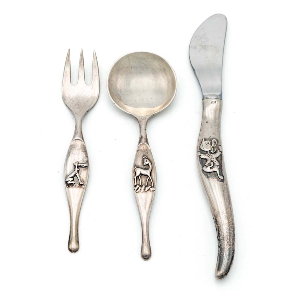 Tre posatine da bambino in argento 800/000 caratterizzate ognuna da un cerbiatto, un cane ed un papero vestito  cm 11 e cm 15 - gr. 30 escluso il coltellino