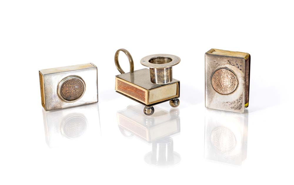 Due portafiammiferi con moneta e piccola bugia in argento a diverso titolo portafiammiferi in argento sterling, di cui uno con moneta tunisina della Maison Bulgari - Roma e l'altro con moneta austriaca; la piccola bugia con portacandela su base rettangolare con presa sagomata e piedini a sfera (uno mancante) cm 1,5x5,5x4 ca ognuno e cm 5x9,5x4 - peso complessivo gr. 140