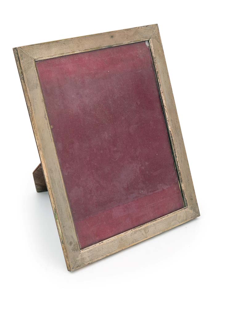 Cornice da tavolo in lamina d'argento forma rettangolare a fascia incisa "a grana di riso"; supporto in legno. Al verso etichetta dell'argenteria Fornari di Roma cm 23,5x18,5 - luce interna cm 20x15