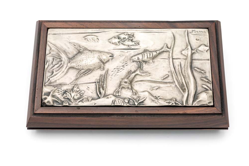 Lotto 726 | Scatola rettangolare in legno con bassorilievo in argento 925/000 firmato...