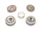 Cinque portapillole in argento diversi due di forma circolare con volute incise ed inserto in porcellana decorato da una testa di cervo e di cane (cm 0,8x3,5); due ovali rispettivamente in filigrana e con quarzo rosa (cm 1x3,5x2,5 ca. ognuna) ed una piccola circolare (diametro cm 2,5)