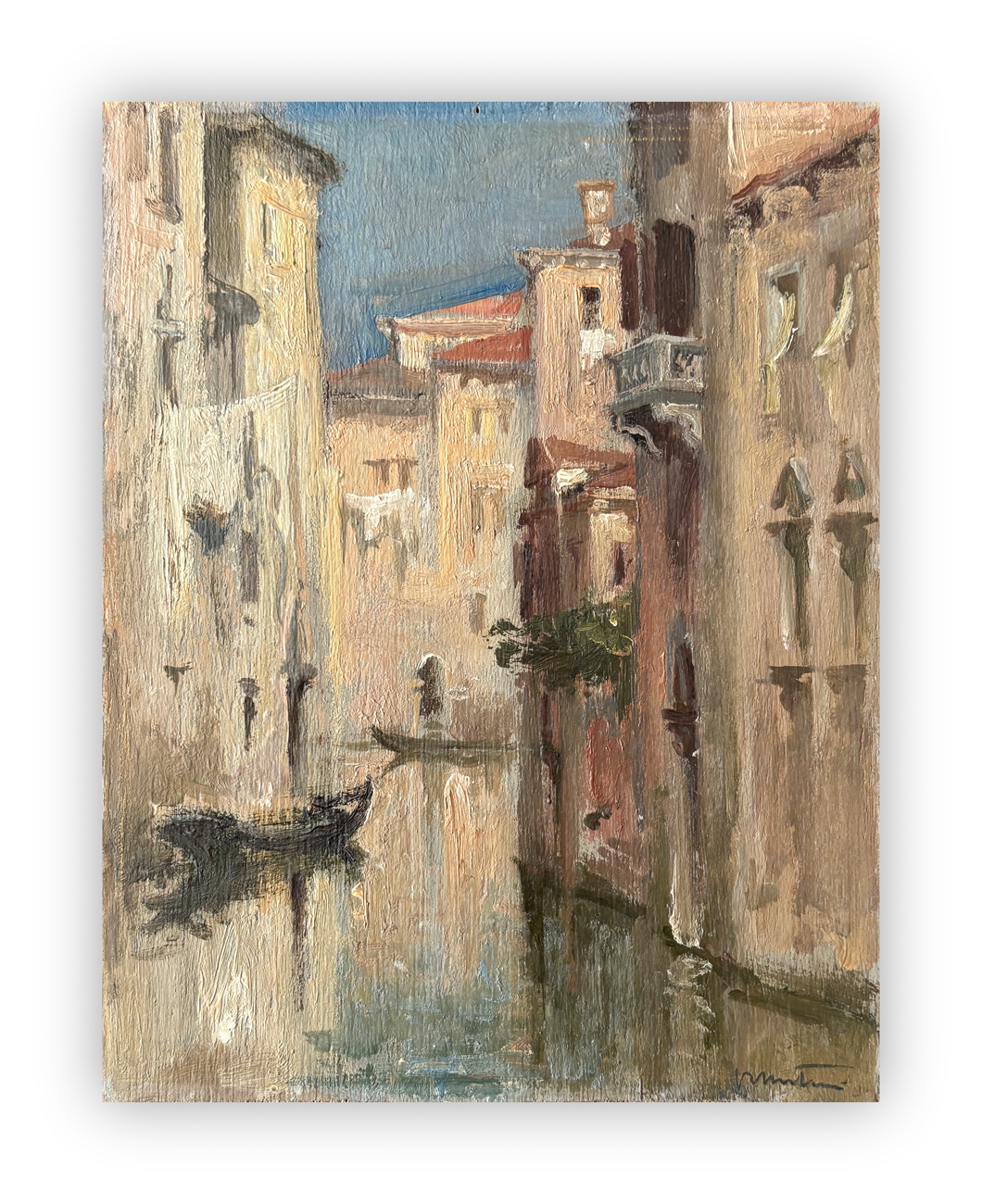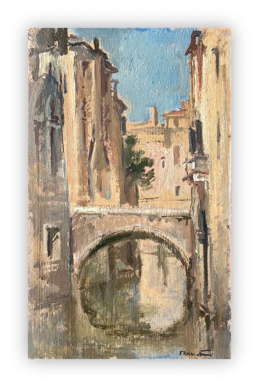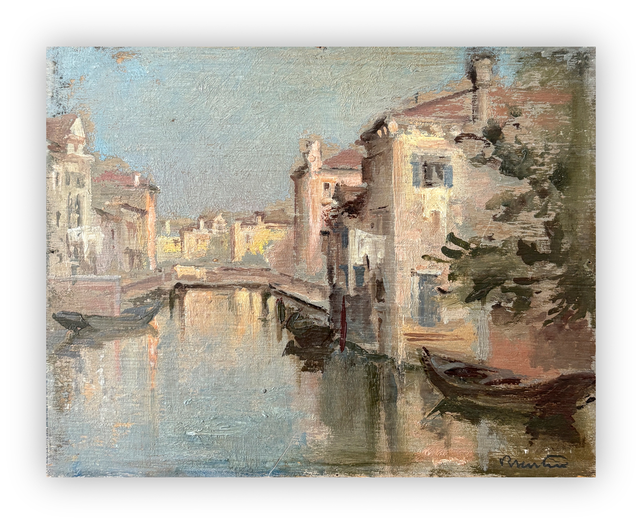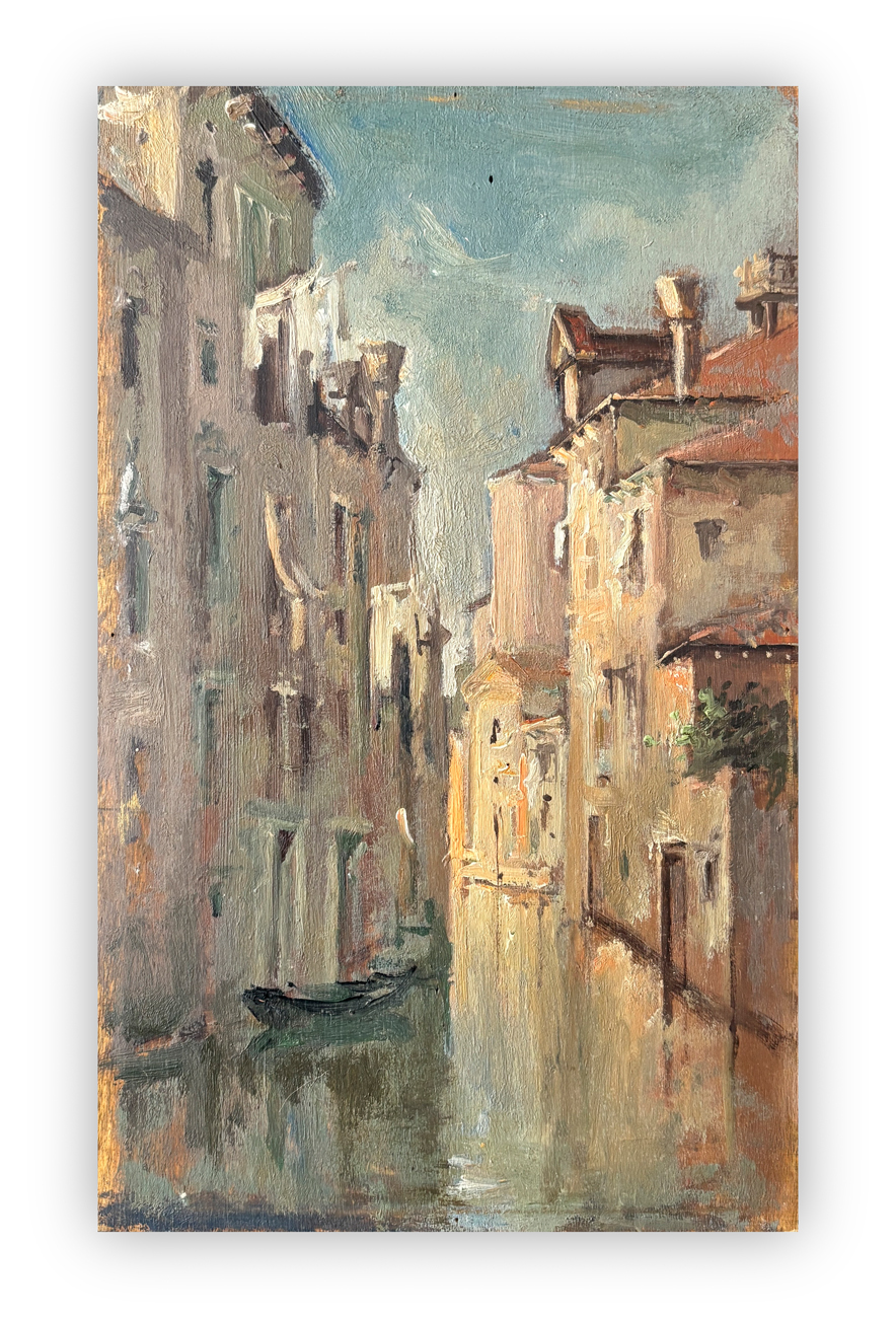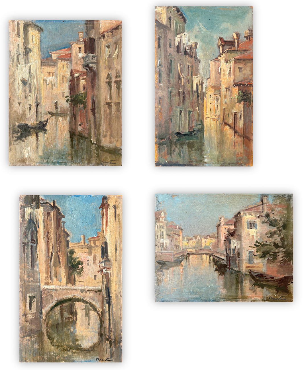 Lotto unico di 4 dipinti a olio su tavola raffiguranti scorci veneziani (Rio alla Giudecca, Rio S. Giacomo, Rio Ognissanti, Venezia)