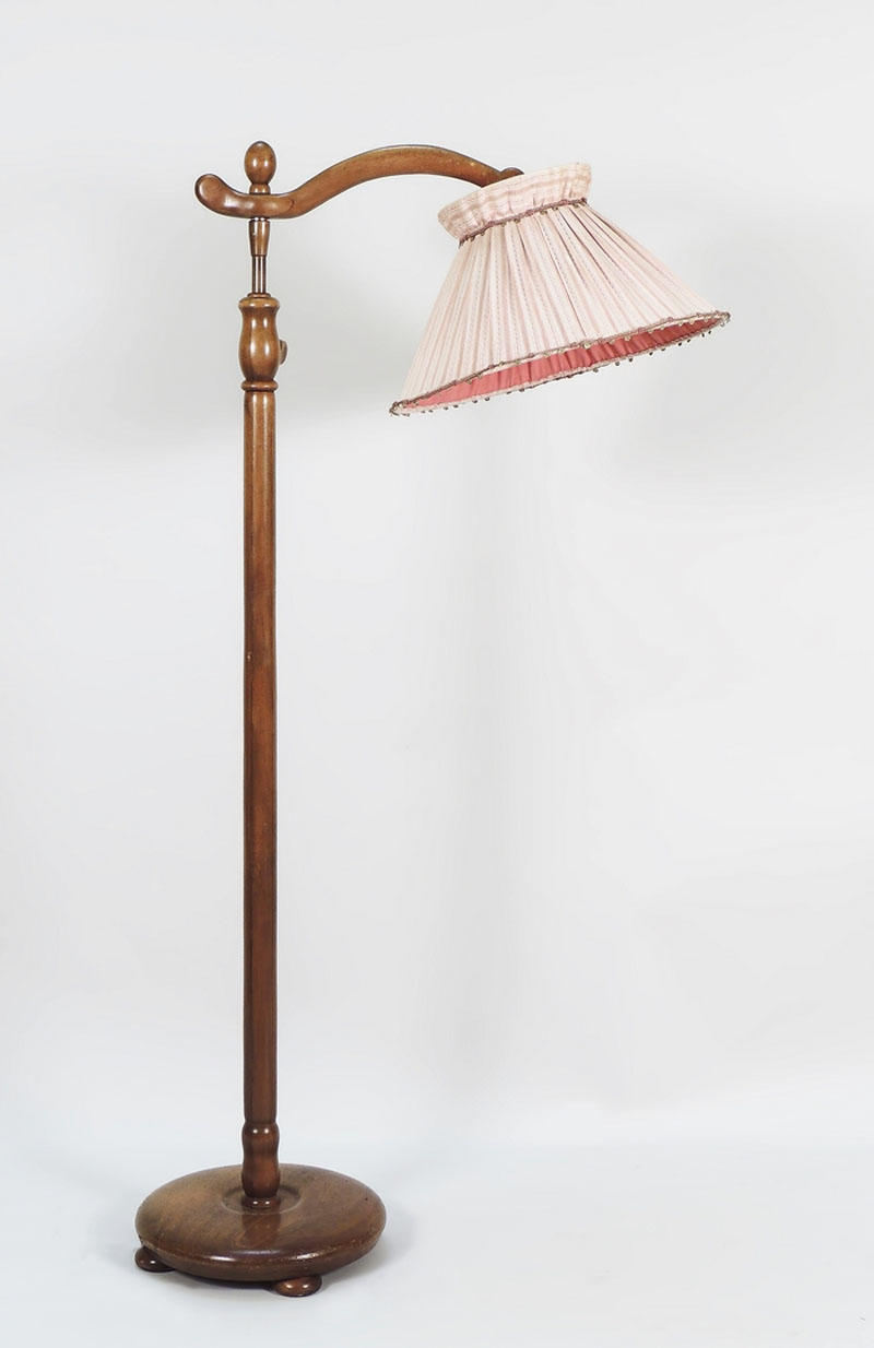 PIANTANA IN NOCE inizio del XX secolo altezza regolabile, base circolare su tre piedini, corredata di paralume in tessuto plissettato WALNUT FLOOR LAMP