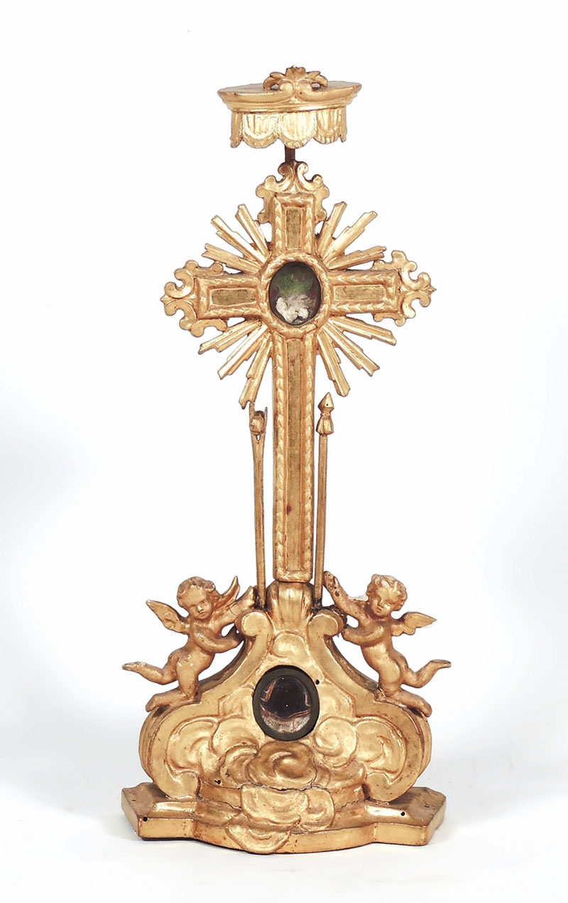 RELIQUIARIO IN LEGNO INTAGLIATO E DORATO Toscana, XVIII secolo realizzato come una croce sormontata da baldacchino, ai lati due puttini che reggono gli strumenti della Passione, base sagomata, difetti h cm 38,5 GILTWOOD RELIQUARY, TUSCANY, 18TH CENTURY