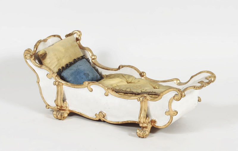 MODELLINO DI LETTO PER BAMBOLE IN LEGNO INTAGLIATO, LACCATO E DORATO Toscana,...