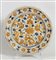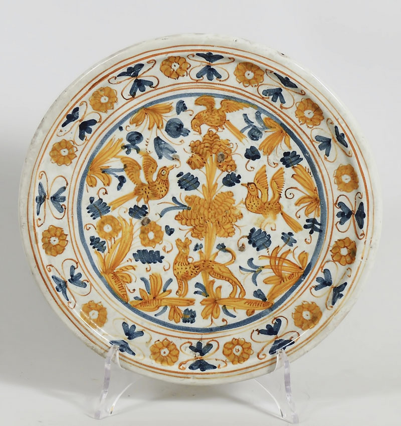 ALZATA IN MAIOLICA Italia Centrale, XVIII secolo dipinta con animali e fiori stilizzati nei toni dell'ocra e dell'azzurro h cm 7, diam cm 25,5 MAJOLICA PEDESTAL BOWL, CENTRAL ITALY, 18TH CENTURY
