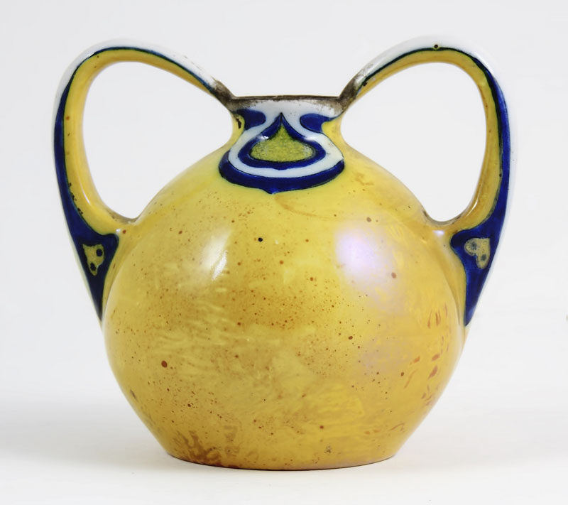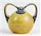 PICCOLO VASO IN TERRACOTTA SMALTATA Galileo Chini, Arte della Ceramica 1898-1902 di forma globulare, due ampie anse, dipinto nei toni del giallo con motivi di gusto liberty in blu h cm 9,5 Reca simbolo grafico della melograna per il periodo 1898-1902 SMALL GLAZED TERRACOTTA VASE, GALILEO CHINI, 1898-1902