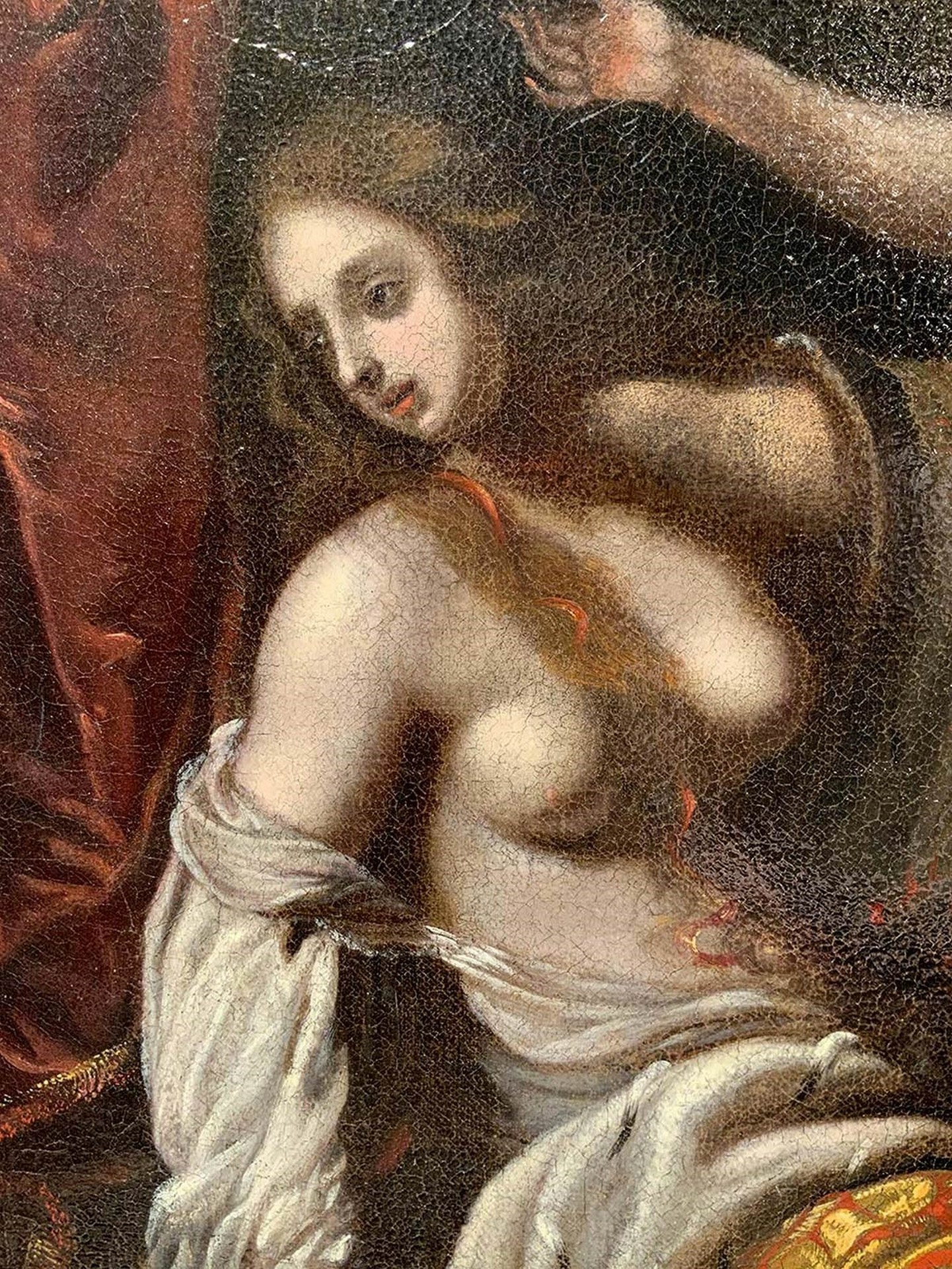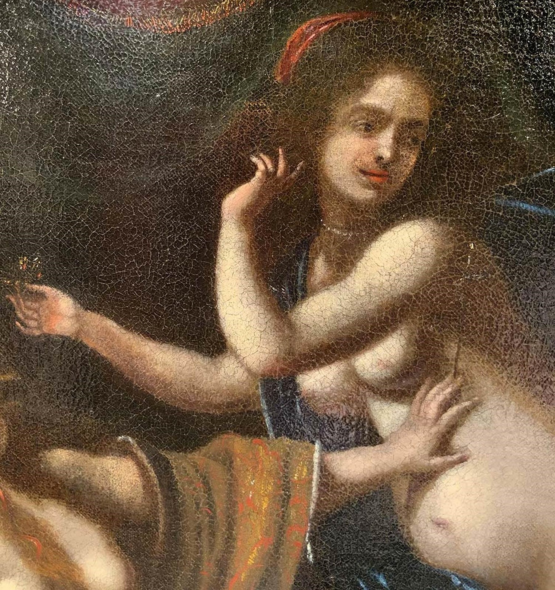 Il Riposo (attribuito a) (San Gimignano 1605 - Firenze 1660) - Arianna addolorata per l'abbandono di Teseo , 17° secolo cm 70 x cm 105; in cornice cm 90 x cm 125 olio su tela Scena mitologica raffigurante Arianna addolorata per l'abbandono di Teseo, Dioniso la consola e le offre la corona con i diamanti che costituiranno la Corona Boreale o Costellazione di Arianna. "L'opera è pervasa da una sottilissima sensualità, di ascendenza furiniana sono la morbidezza dell'incarnato di Arianna e dell'ancella. Arianna addolorata per l'abbandono di Teseo sebbene malinconica emana un castigato ma voluttuoso senso erotico, mentre si strugge per il dolore. L'appropinguarsi dell'opportunista Dioniso fa scaturire una summa di intenzioni e sentimenti tra i personaggi, si da far sembrare che i protagonisti recitino ed emergono come in una piece teatrale. Sulla scena con le loro forme dal carnato luminoso con l'espresse dei volti che esprimono emotività interiore, con l'ampiezza dai movimenti enfatici danno vita ad un'opera che si racconta da sola, impreziosita da artifici pittorici creati dal pittore, come le zone d'ombra che accendono di luce le forme. In tutto questo il pittore mostra affinità con i suoi contemporanei: Furini Francesco (1603-1641) e Cecco il Bravo (1601-1661), suoi coetanei." STUDIO ASOR