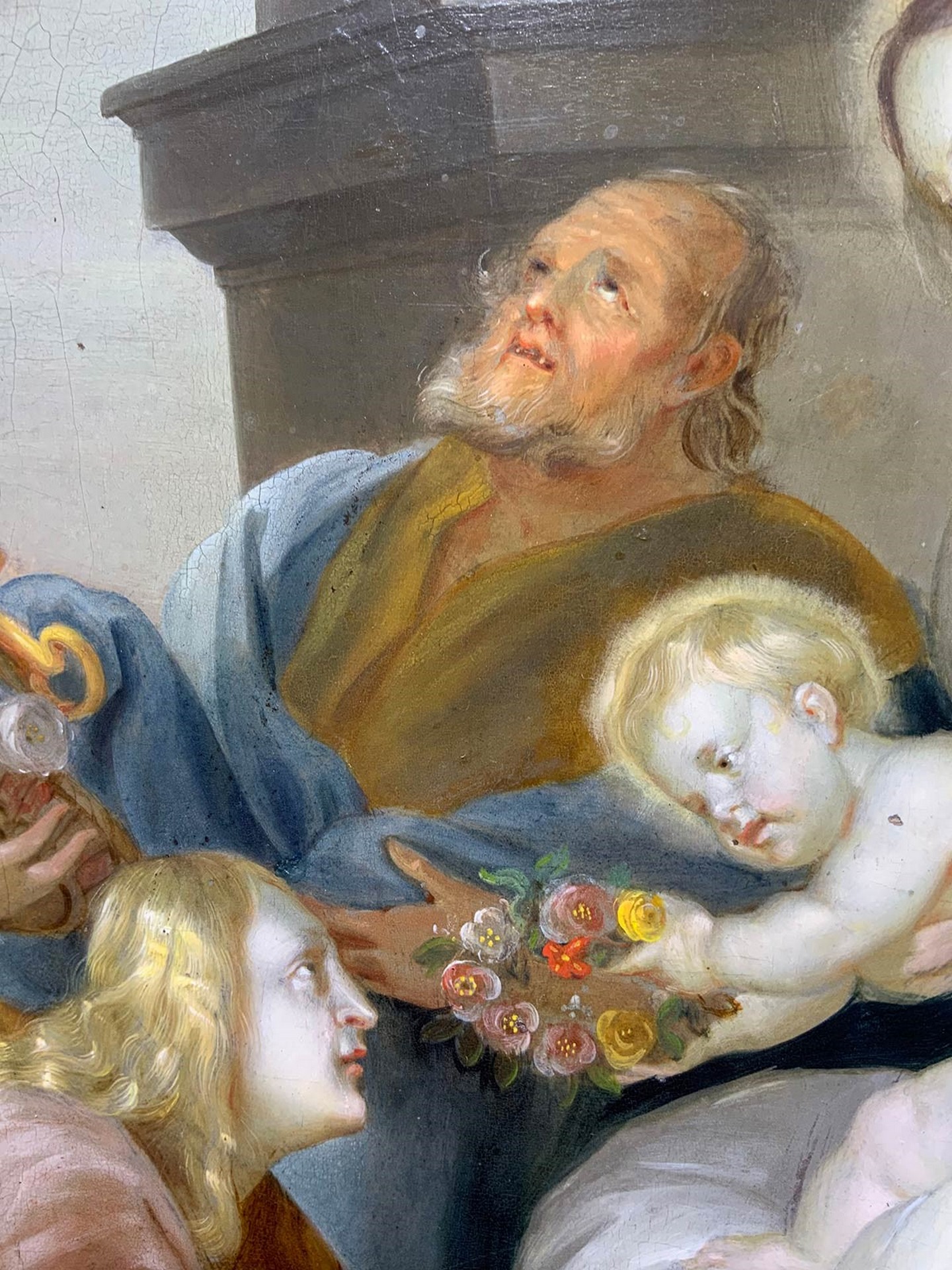 Santa Rosalia con Madonna, Gesù bambino e Santi Pietro e Paolo a latere, 17° secolo cm 43 x cm 35 olio su tavola di rovere Pittore fiammingo del XVII Secolo. Riferimento alla pala da Antoon van Dyck presente al Kunsthistorisches Museum (Vienna)