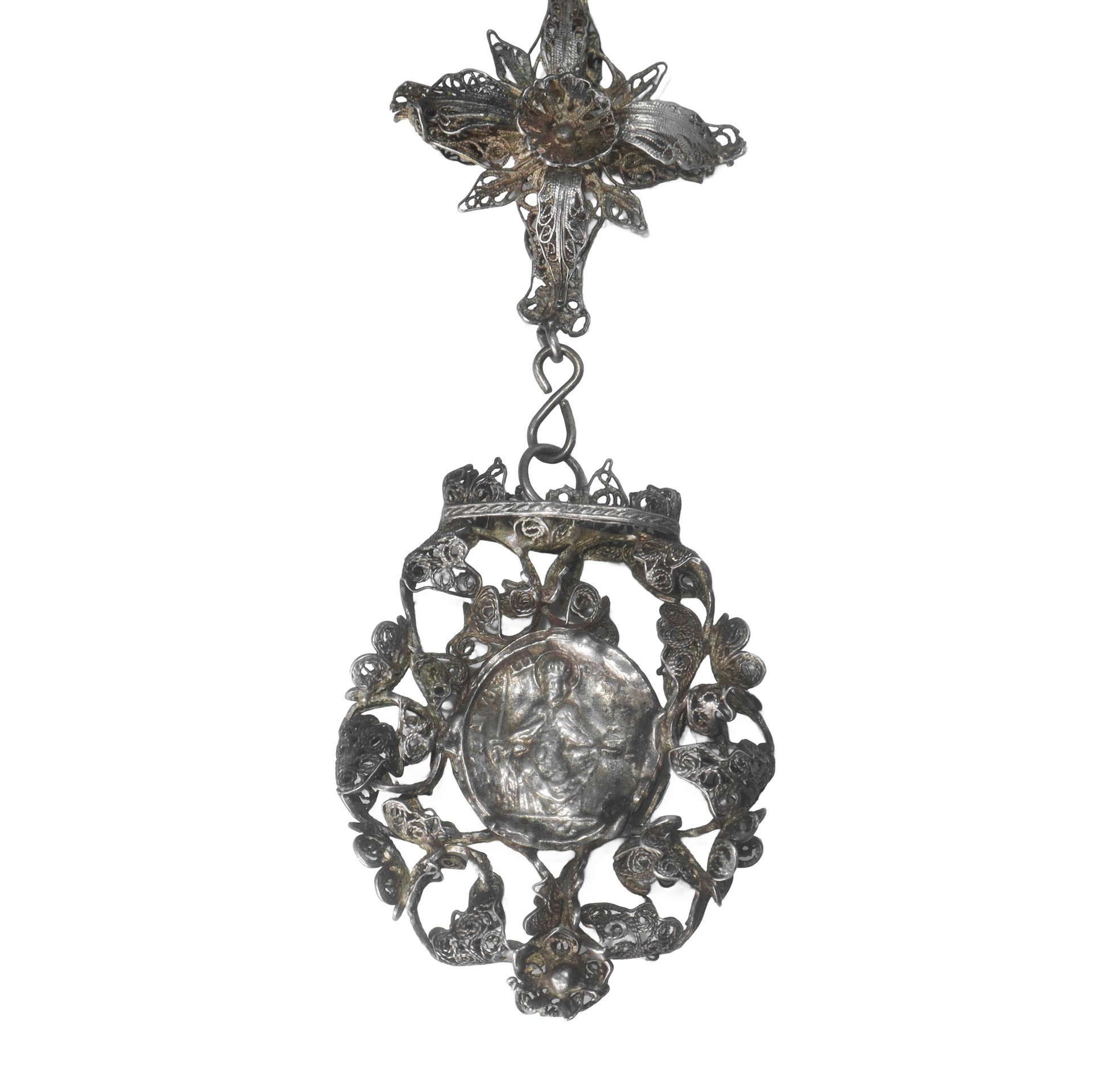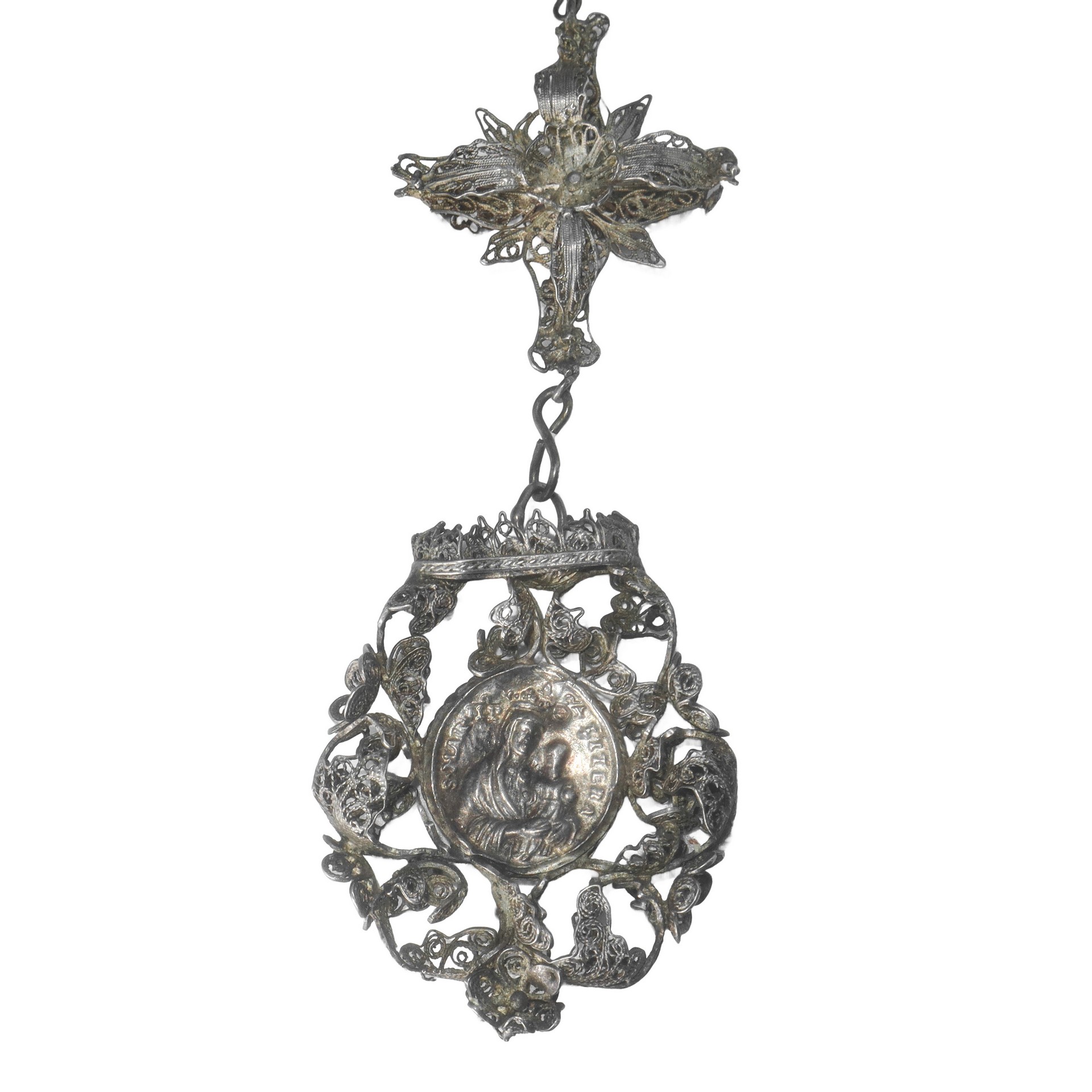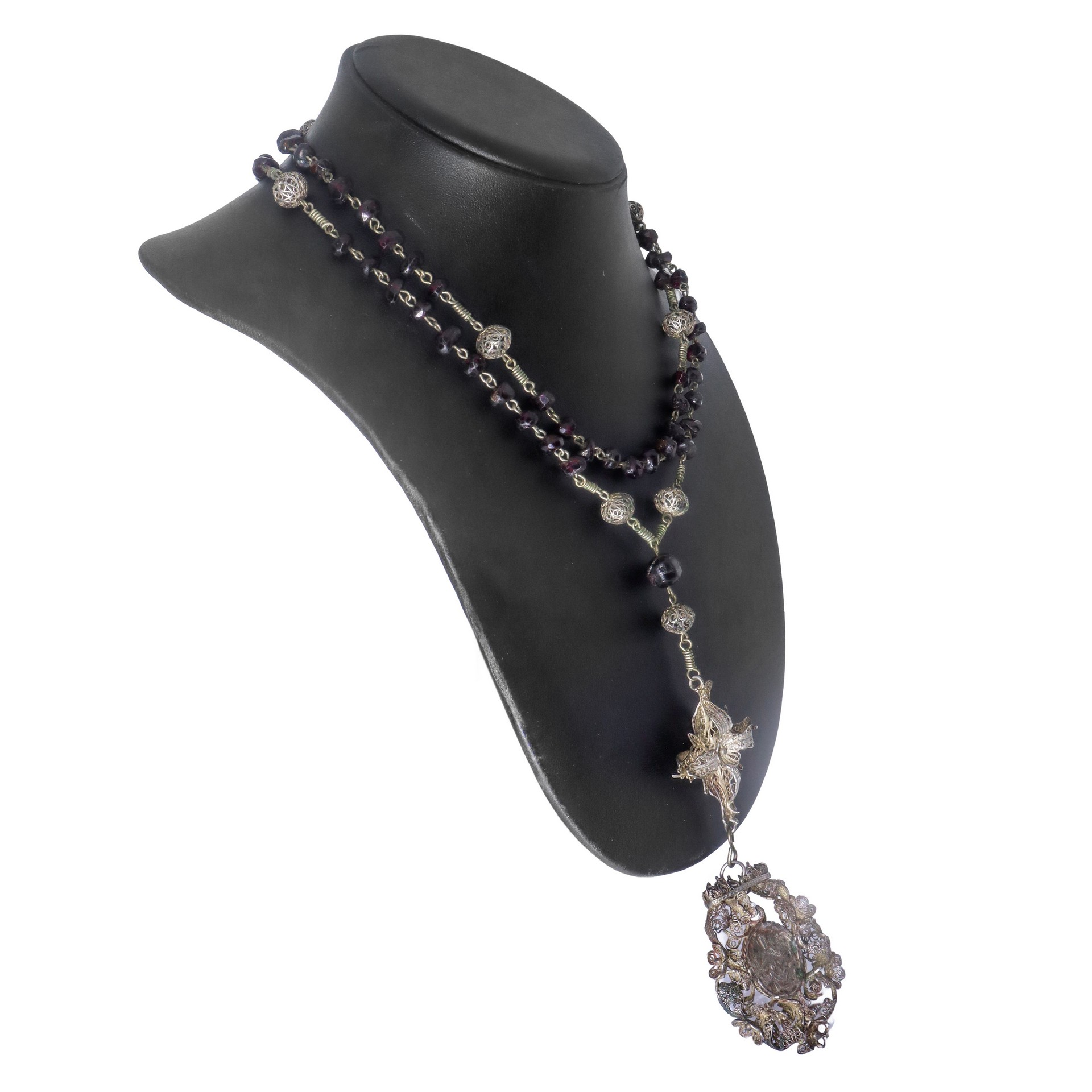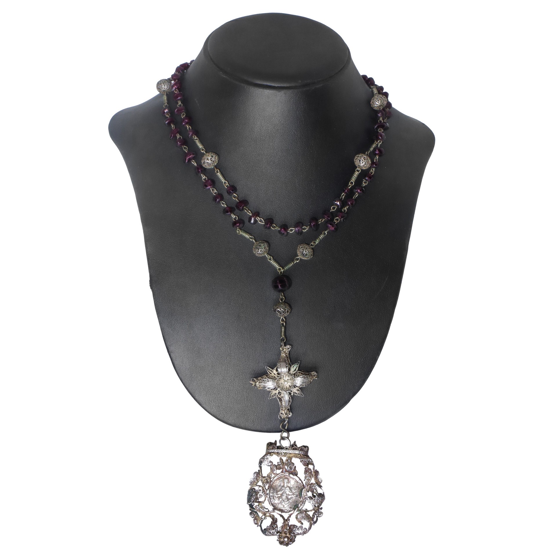 Lotto 114 | Rosario con medaglioni in argento filigranato e Croce filigranata, grani in vetro granatina
