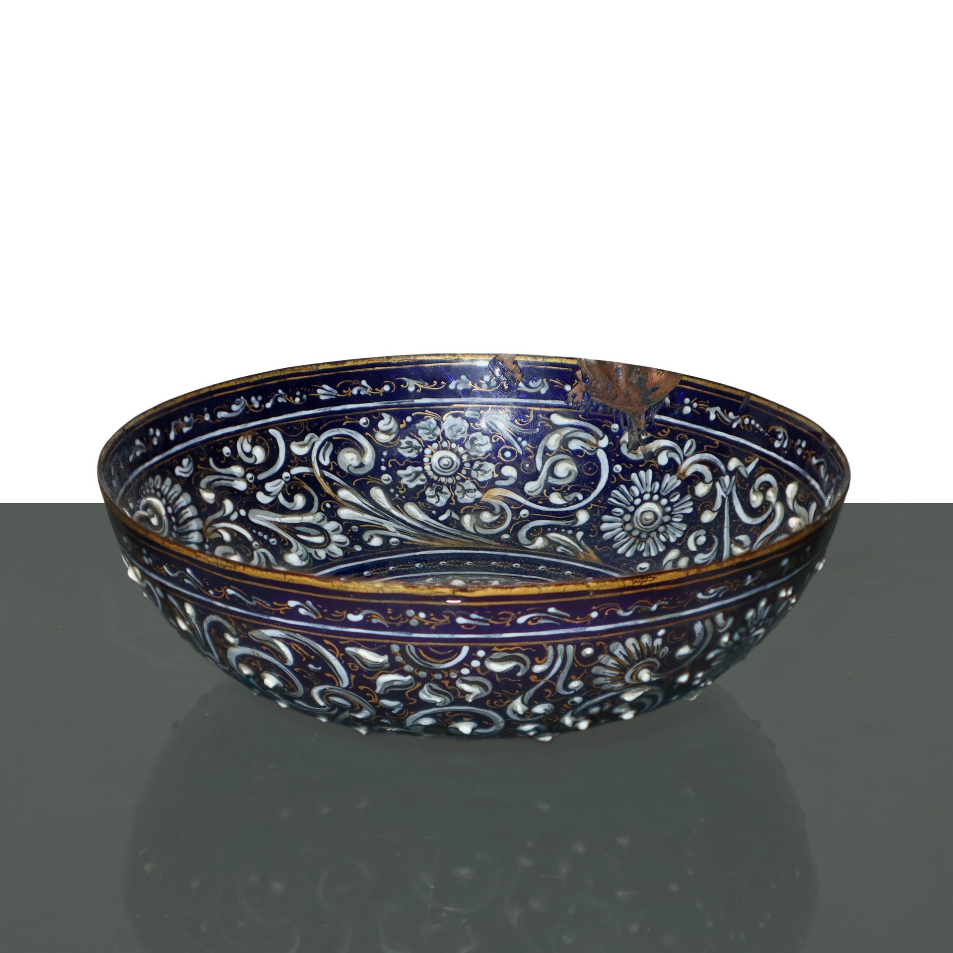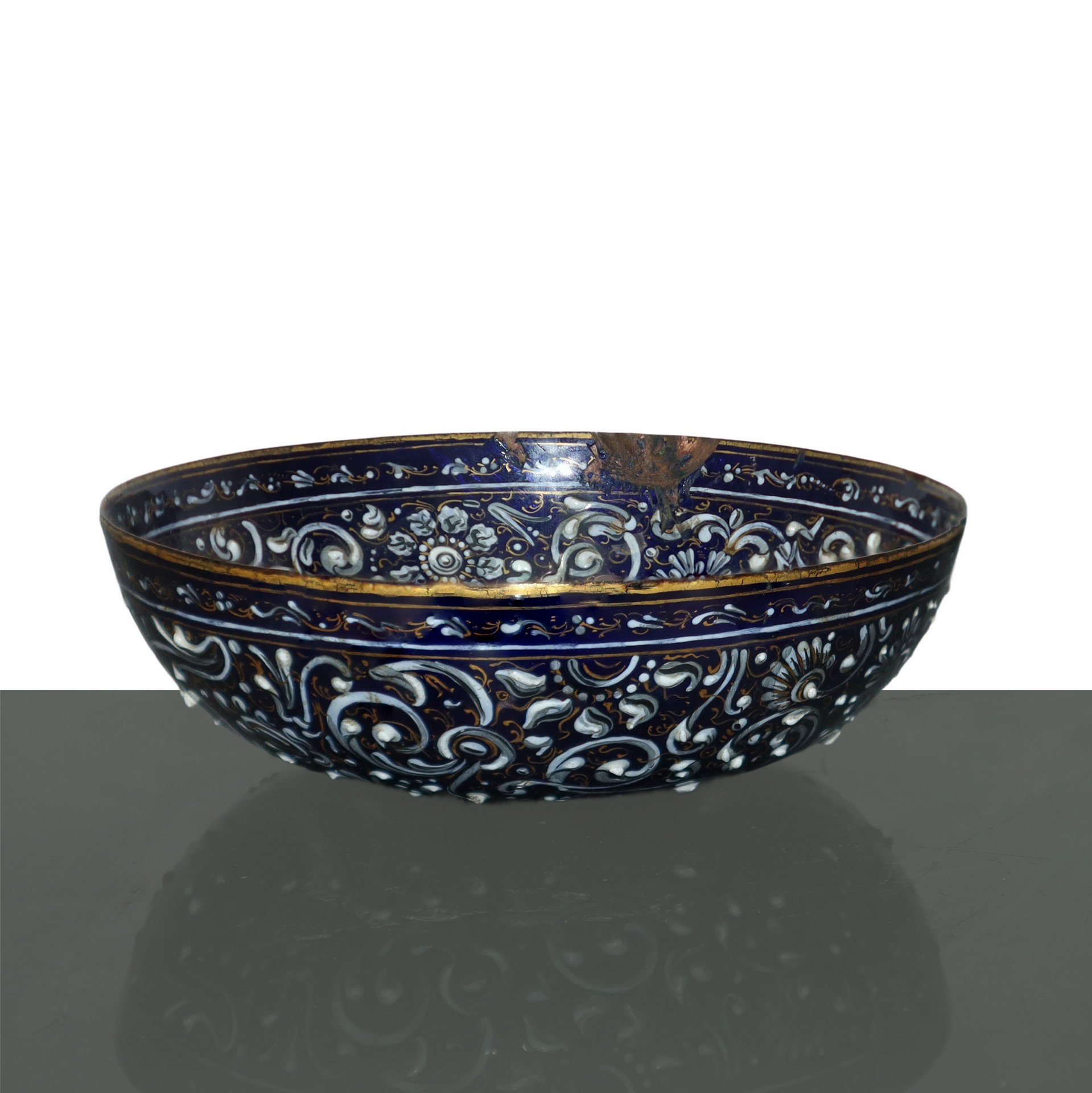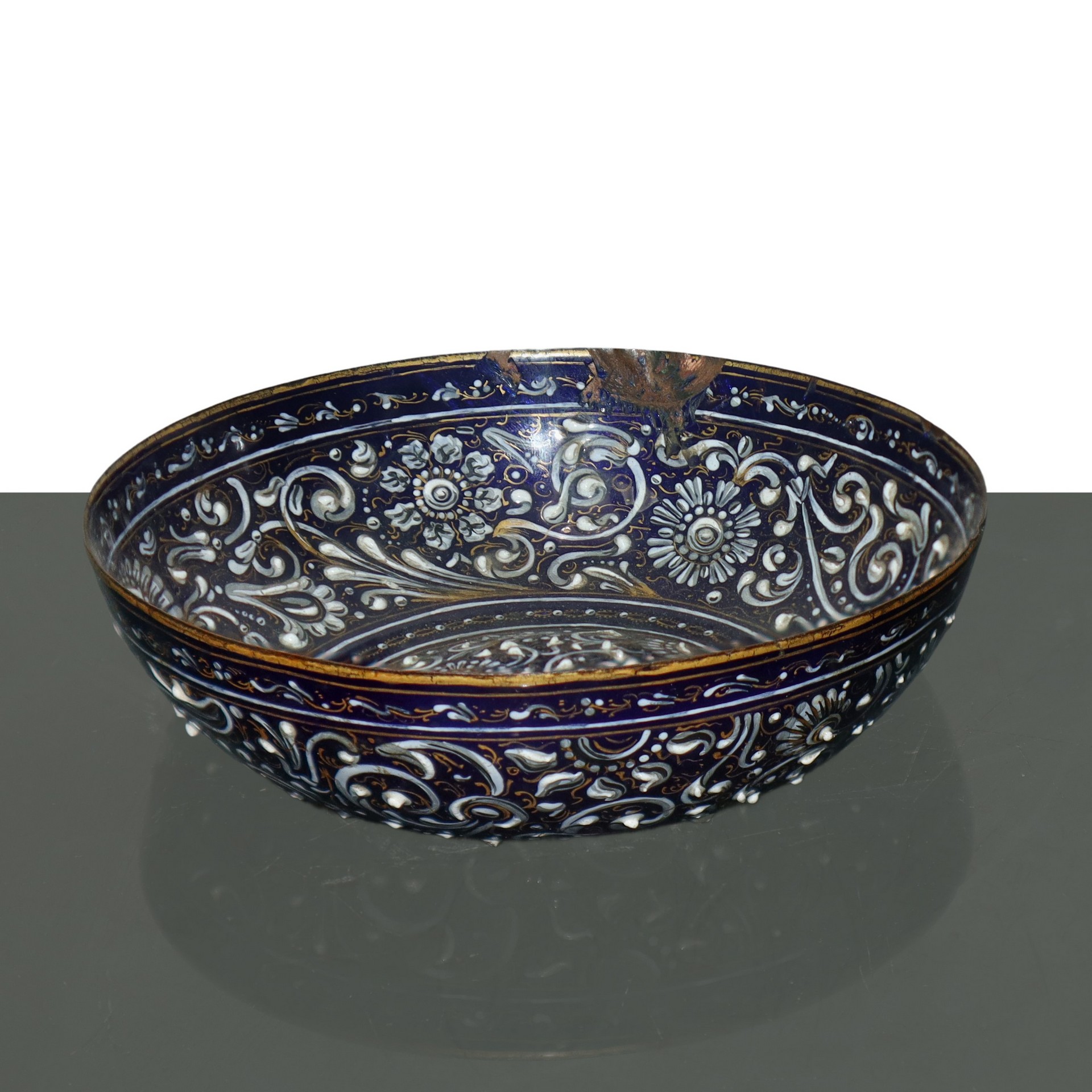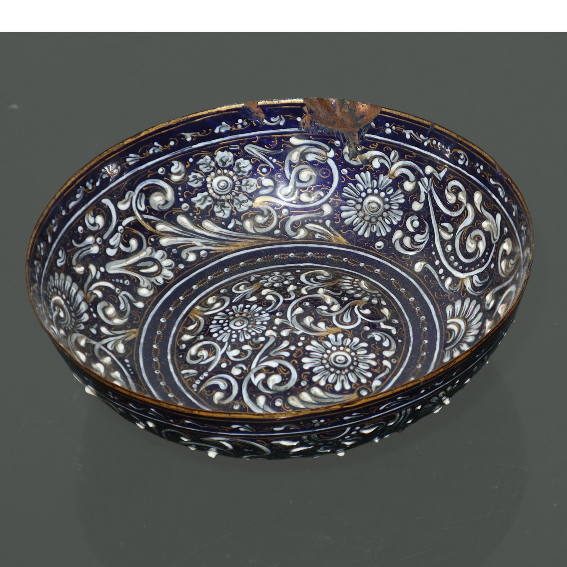 Limoges - Pierre Reymond (attribuito a) (1513 - 1584) - Ciotola a motivi rinascimentali con smalti cloisonne di sottili fili d'oro su base blu e smalti floreali bianchi applicati su rame, 16° secolo h cm 4, diametro cm 12,2 Pierre Reymond,artista operativo con una grande bottega a Limoges, tra i più prolifici produttori di smalto del '500 specializzato soprattutto nel vasellame smaltato. La tavolozza del blu e bianco su questo oggetto è ravvivata dall'uso dei fili d'oro al fine di acquisire luminosità.