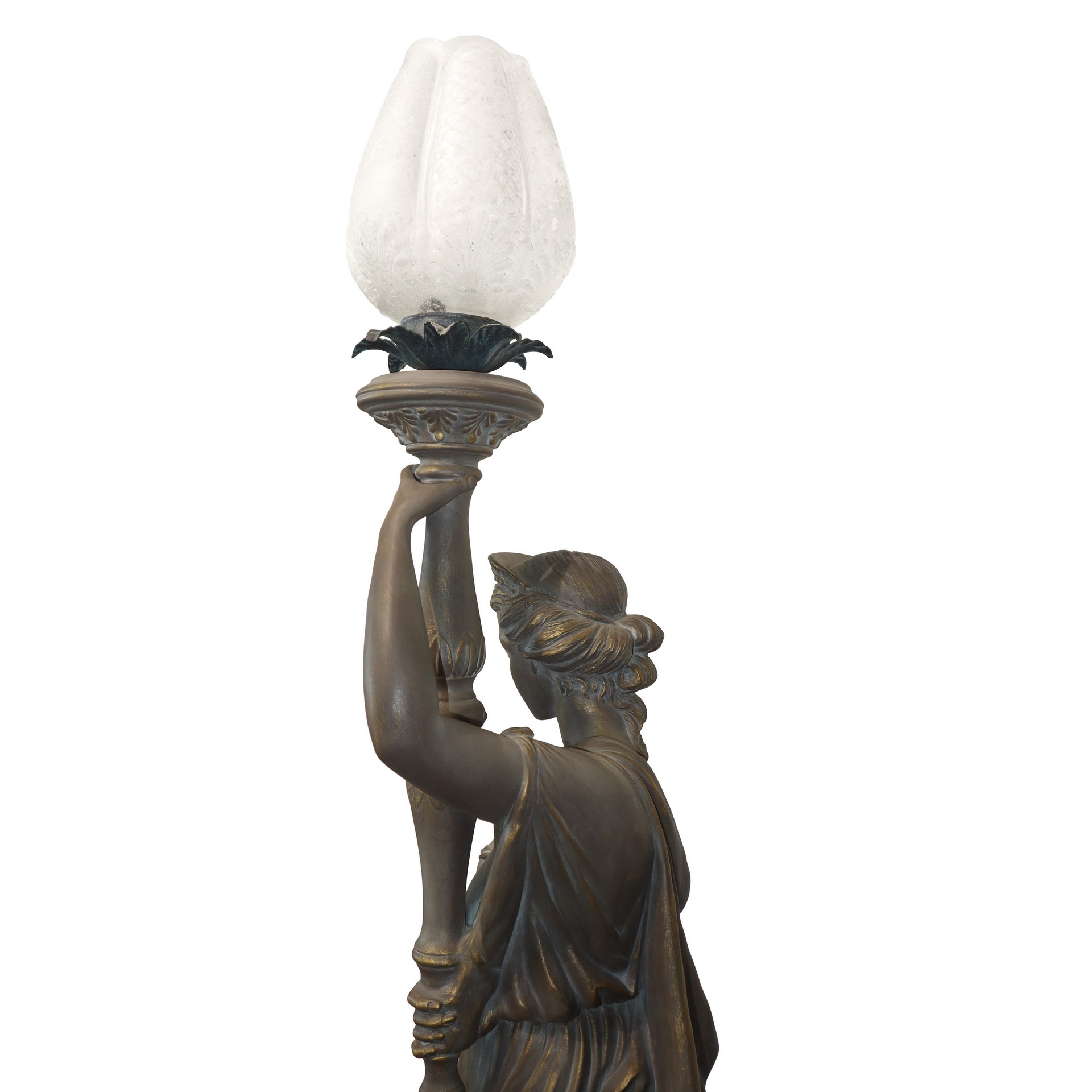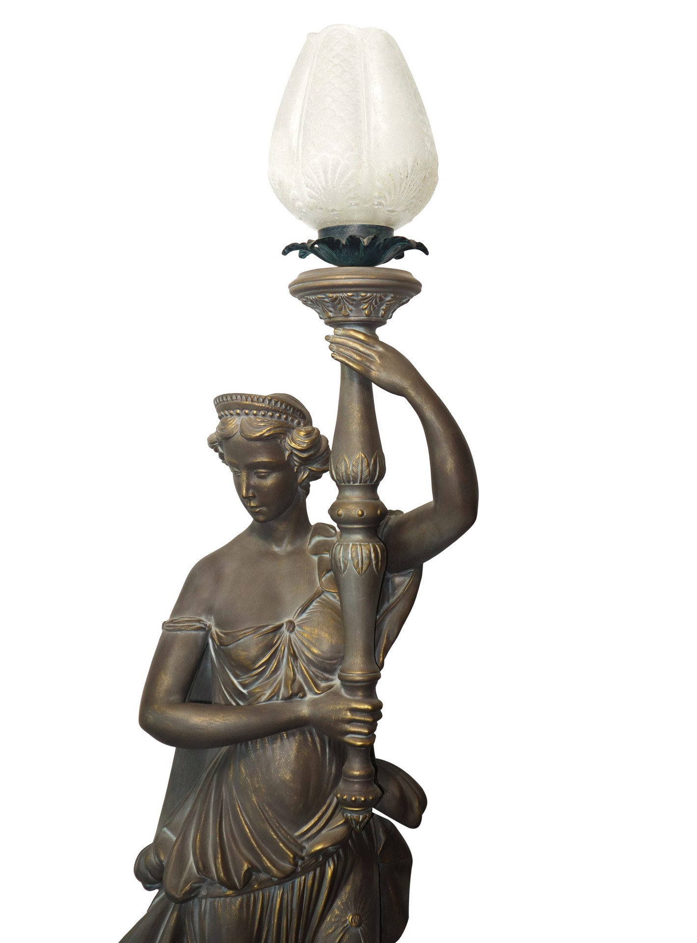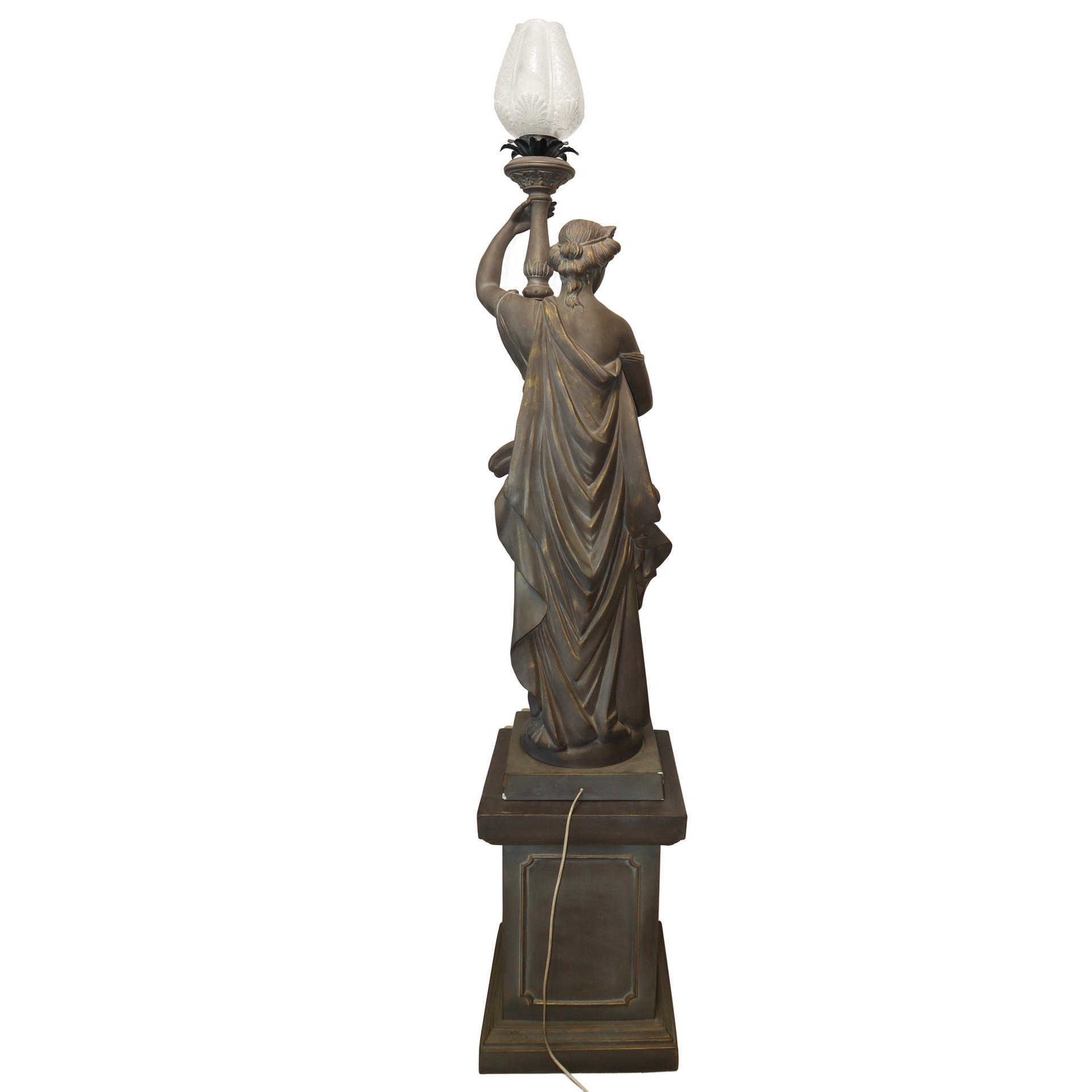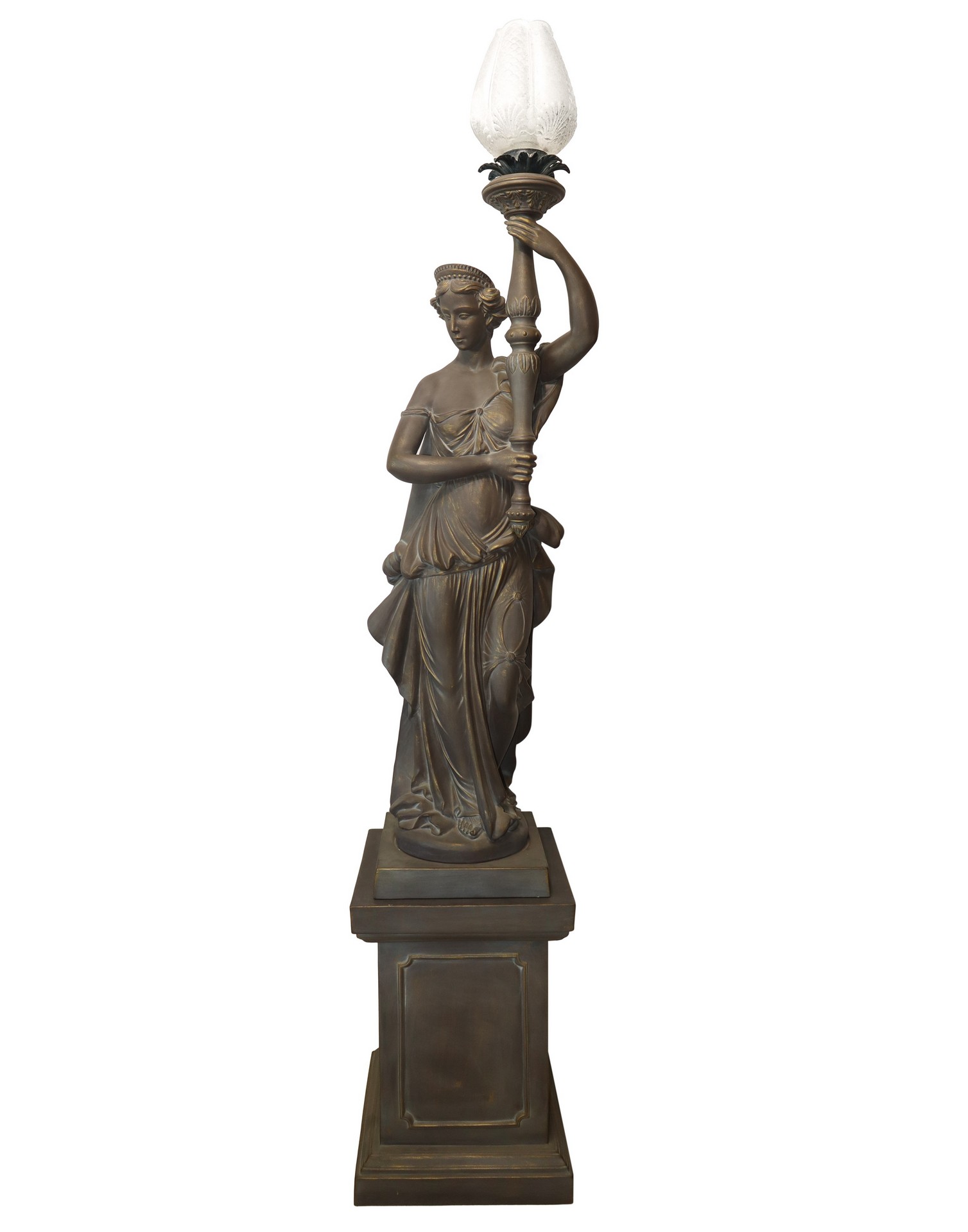 Statua reggilampada Liberty con piedistallo patinata grigio e oro , fine 19th/20° secolo