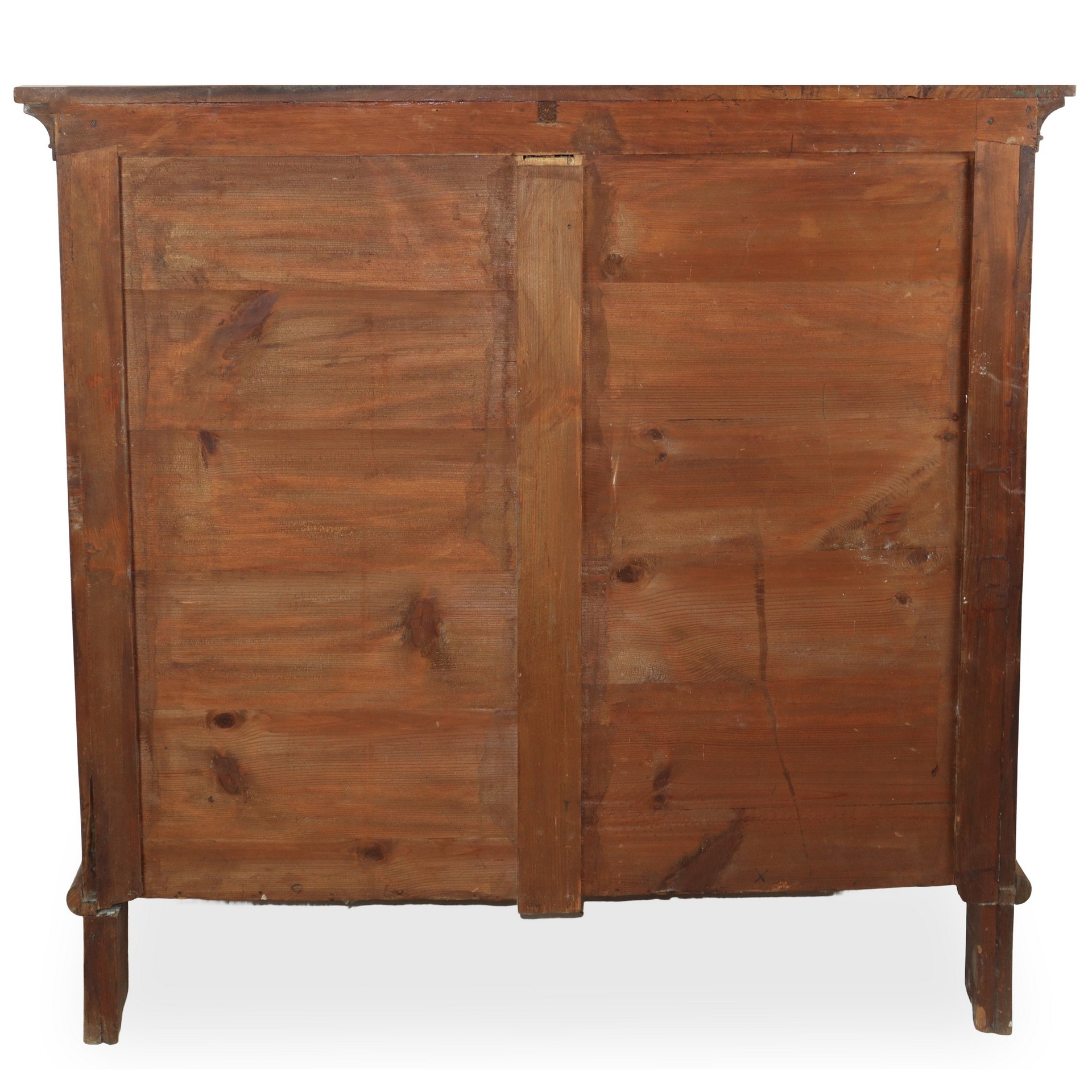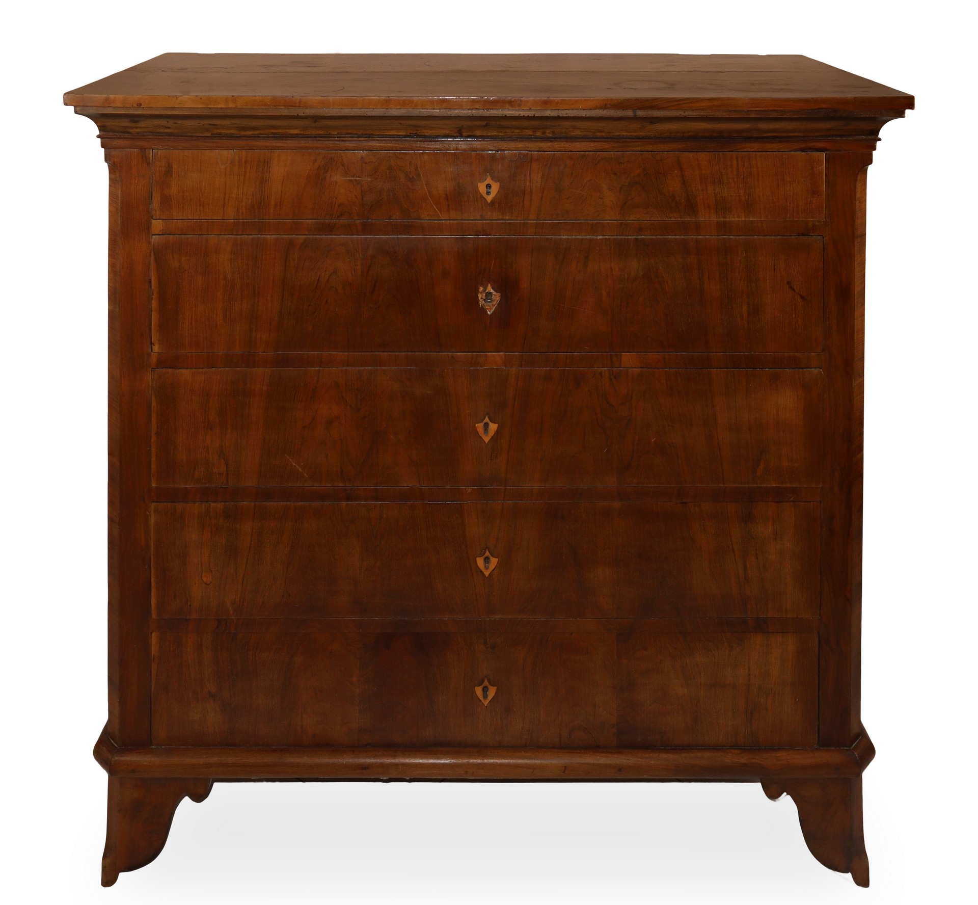 Cassettone a 5 cassetti in noce e radica di noce , Sicily 19° secolo 124 x 127,5 x 58,5 cm Angoli smussati bocchete a scudo e piedi a mensola