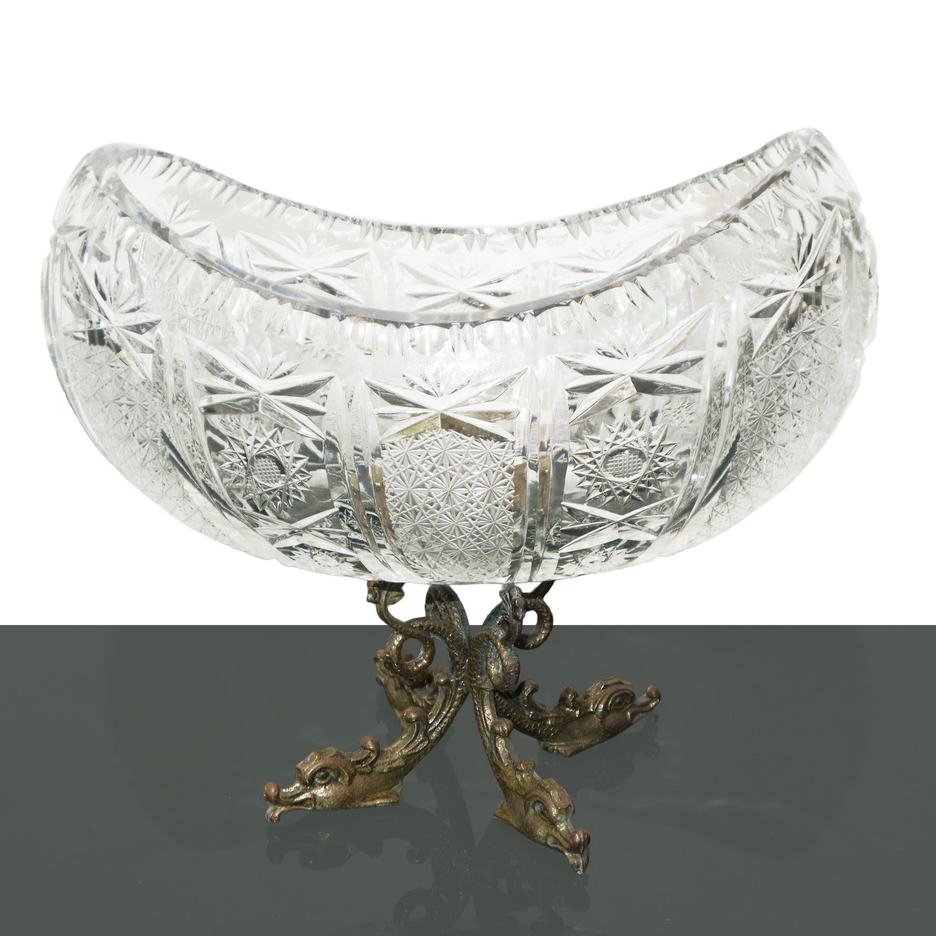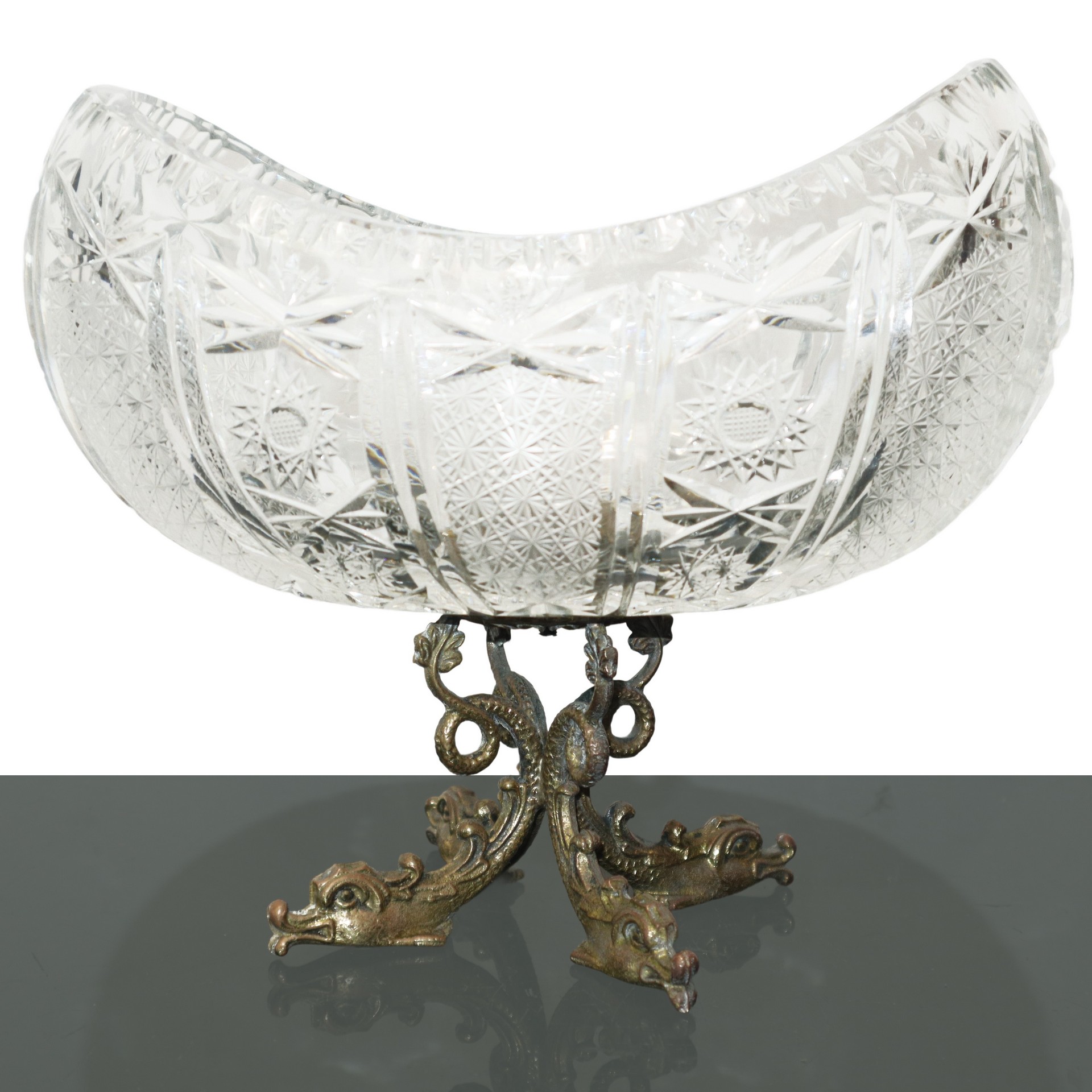 Alzata in cristallo bulinato con base in ottone a guisa di tritoni H cm 22 , Ovale cm 23x14 Minime sbeccatureMinime sbeccature