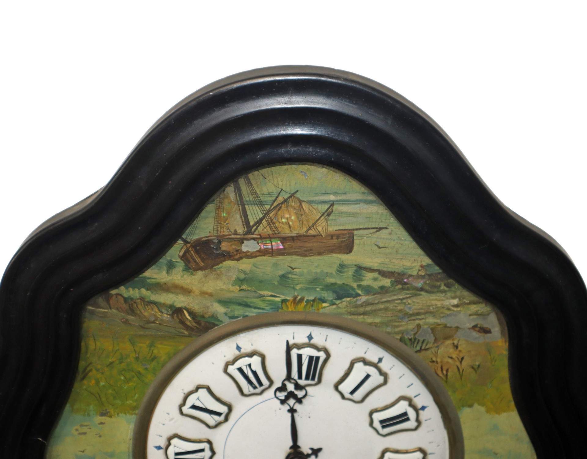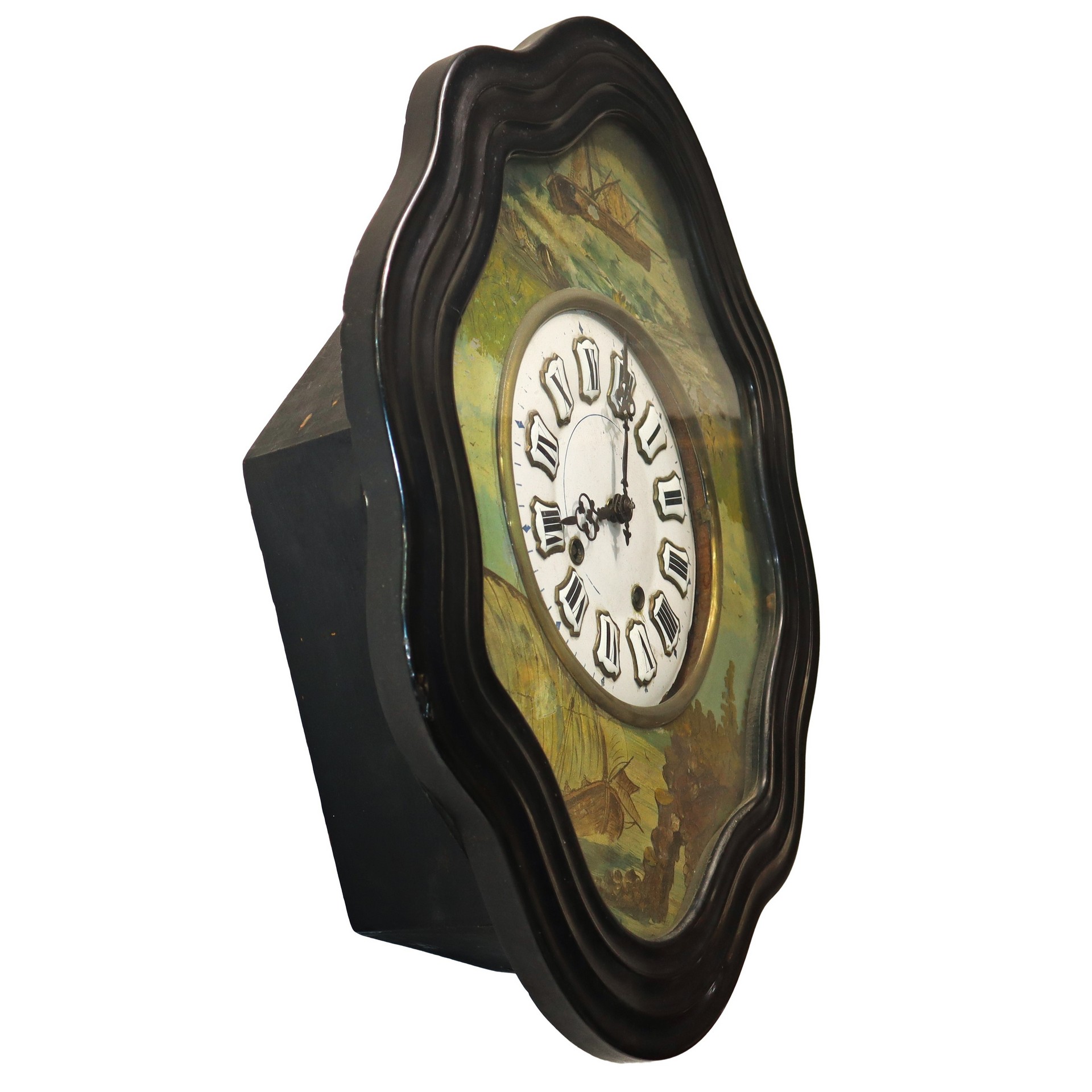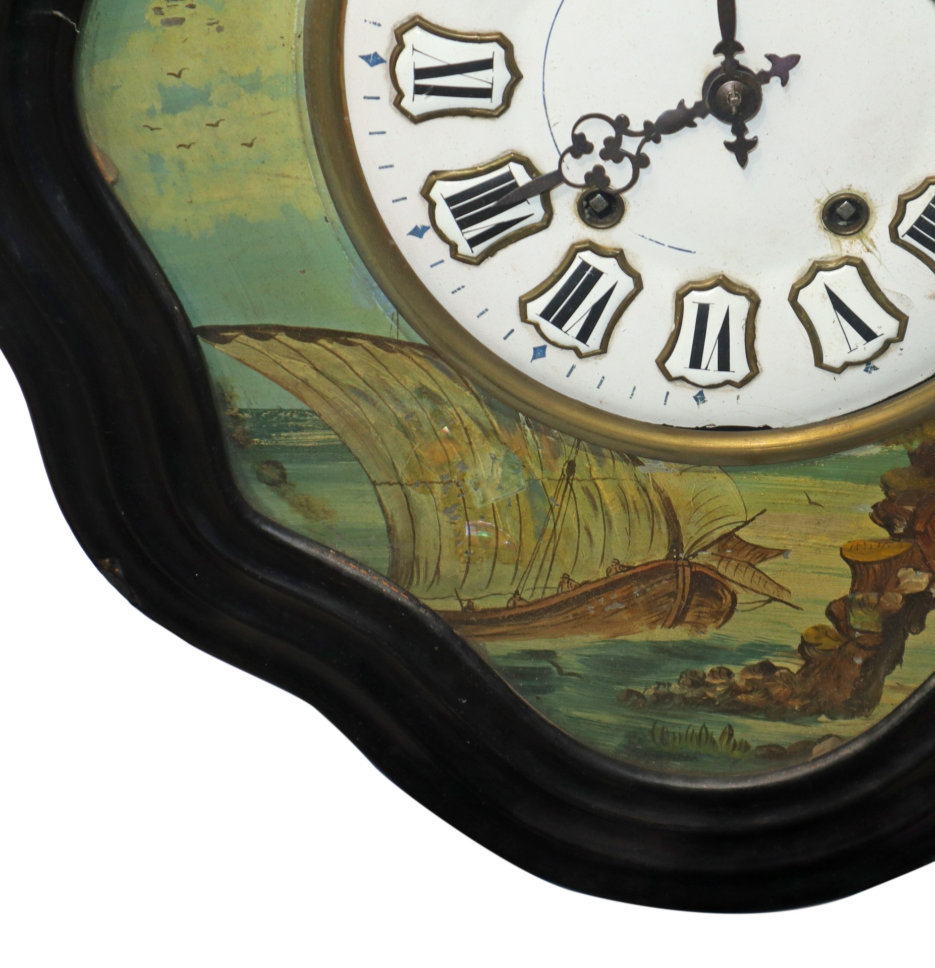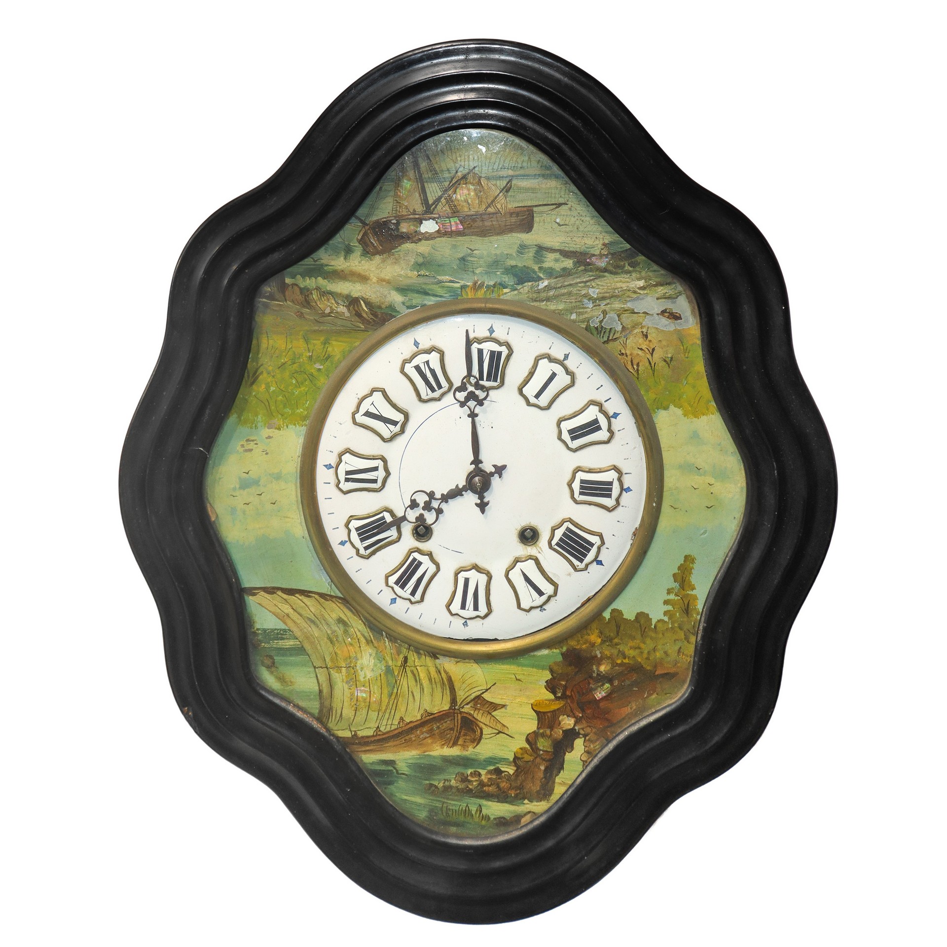 Orologio a occhio di bue da parete con velieri dipinti intorno al quadrante, 19° secolo