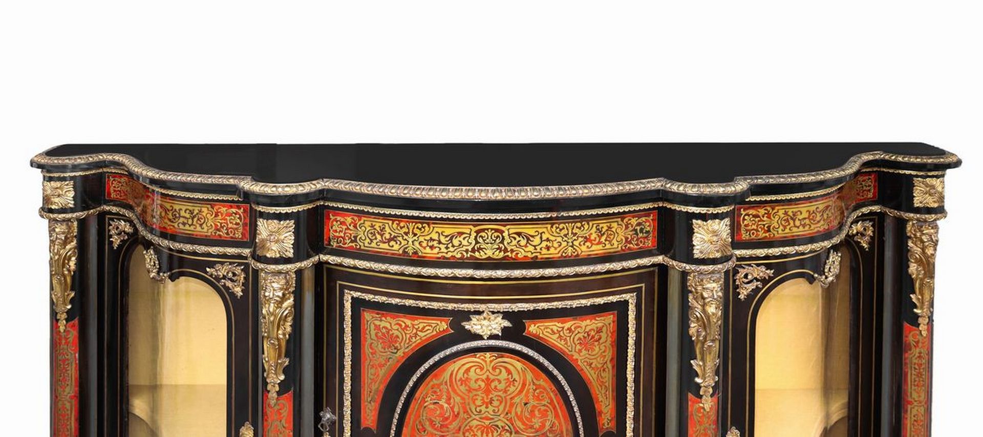 Etagère boulle con bronzi su marquetterie di tartaruga e rame, Napoleon III, France, fine 19° secolo. H cm 116 x L cm 208 x P cm 52 Con sportelli laterali in vetro bombatoCon sportelli laterali in vetro bombato