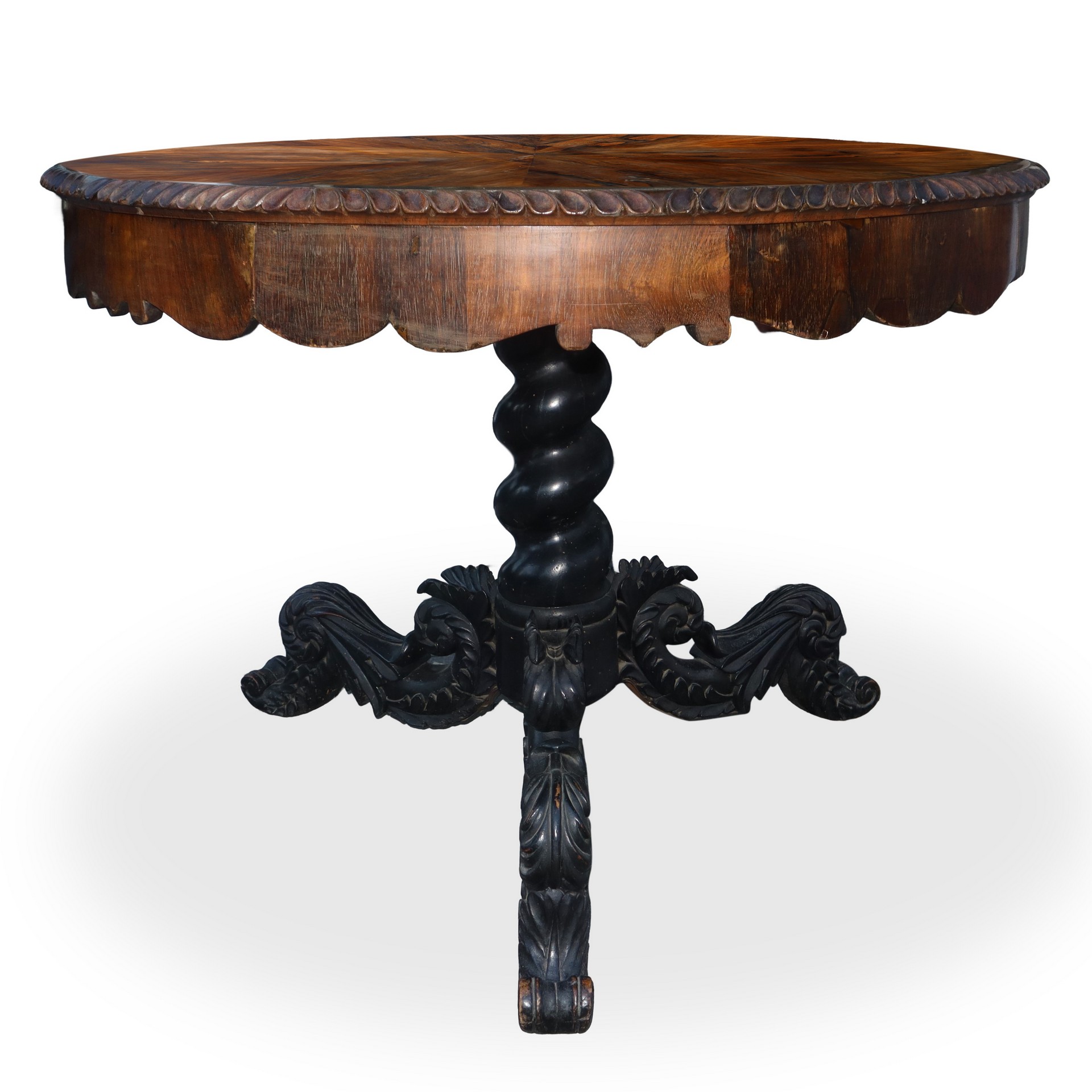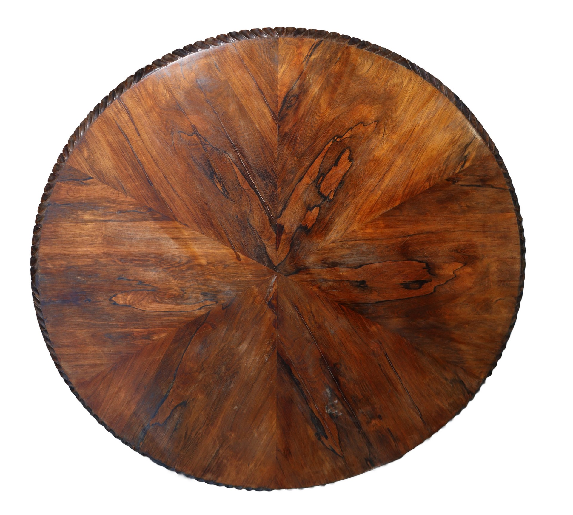 Tavolo rotondo con piano dentellato al bordo piede a tre razze scolpito e intagliato in legno di palissandro