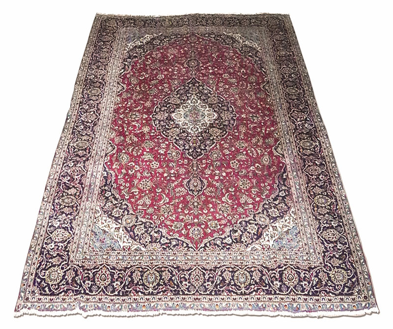 TAPPETO PERSIANO KEISHAN vecchia manifattura fondo rosso, campo con medaglione ce ntrale e motivi floreali nei toni del blu, celeste e beige cm 380x290 KEISHAN PERSIAN CARPET