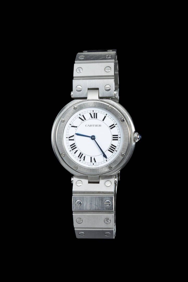 Cassa in acciaio con fondello avvitato. Quadrante bianco con numeri romani e minuteria a binario serigrafati. Bracciale integrato in acciaio con chiusura clasp. Movimento al quarzo.
