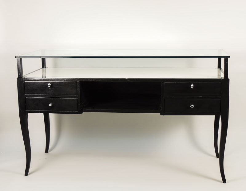 TAVOLO CONSOLE IN LEGNO LACCATO NERO piano rialzato in cristallo e sottopiano a specchio, fronte con vano centrale a tiretto e quattro mezzi cassetti laterali, gambe mosse h cm 93x152x62 BLACK LACQUERED CONSOLE TABLE