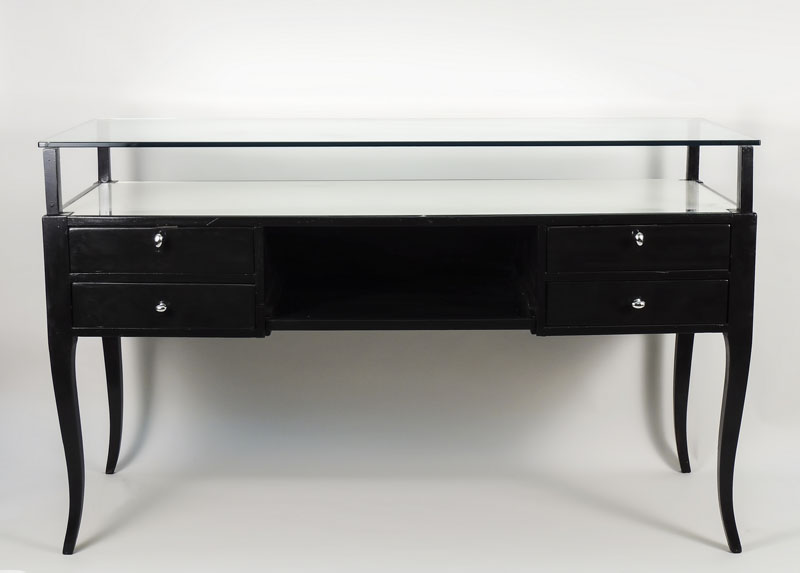 Lotto 321 | TAVOLO CONSOLE IN LEGNO LACCATO NERO piano rialzato in cristallo e sottopiano...