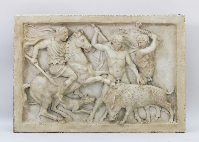 BASSORILIEVO IN MARMO raffigurante Scena di caccia al cinghiale cm 54,5x75,5...