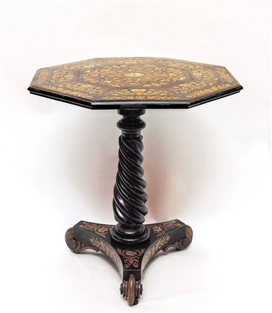 TAVOLINO OTTAGONALE IMPIALLACCIATO IN PALISSANDRO Firenze, Bottega Falcini, metà del XIX secolo intarsiato con motivi floreali in legni di frutto, madreperla e avorio, sostegno centrale tornito ebanizzato su base triangolare intarsiata con gli stessi motivi del piano poggiante su tre piedi a voluta a nascondere ruote h cm 72x67x67 BEECHWOOD VENEERED OCTAGONAL TABLE, FLORENCE, ATELIER FALCINI, MID 19TH CENTURY