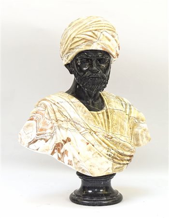 GRANDE BUSTO DI MORO con turbante e vesti in onice e volto marmo nero h cm 73 BLACK MARBLE AND ONYX BUST OF A MAN WITH TURBAN