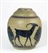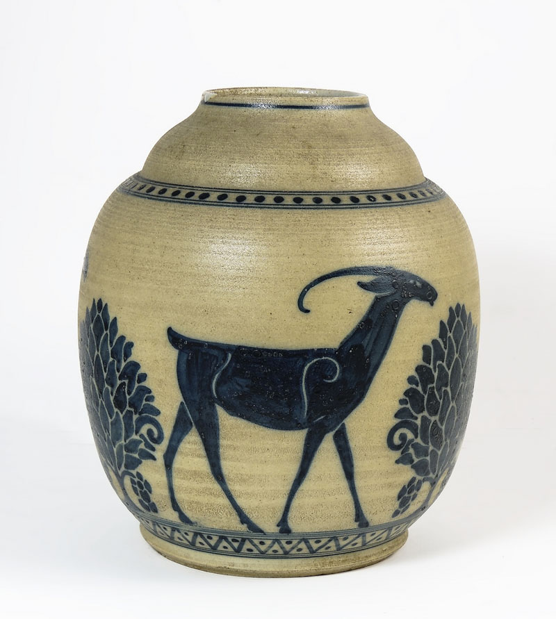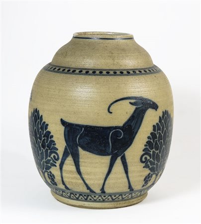 VASO IN GRES SALATO Galileo Chini, Fornaci di San Lorenzo 1906-1920 dipinto in monocromia blu con antilopi alternate a cespugli stilizzati h cm 21 Reca simbolo grafico della grata in sottosmalto blu con il numero di serie 2074 GRES VASE, GALILEO CHINI, 1906-1920