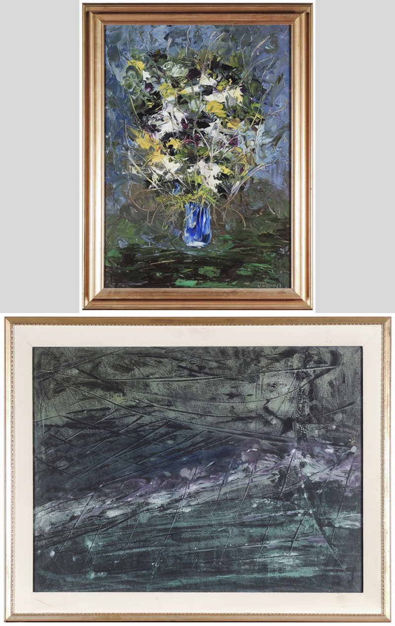 VINCENZO NAPOLI Vaso con fiori Paesaggio Sardo olio su faesite e tecnica mista su carta, uno firmato, in cornice cm 70x50 e cm 43x61 FLOWERS IN A VASE AND SARDINIAN LANDSCAPE, OIL ON FAESITE AND MIXED MEDIA ON PAPER