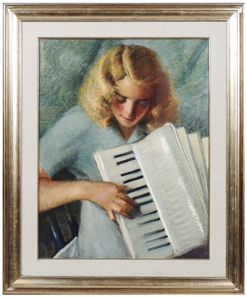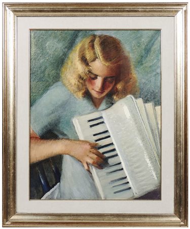 GAETANO SPINELLI (1887-1945) Ritratto di ragazza con fisarmonica olio su faesite, in cornice cm 65x50 PORTRAIT OF A GIRL WITH ACCORDION, OIL ON FAESITE