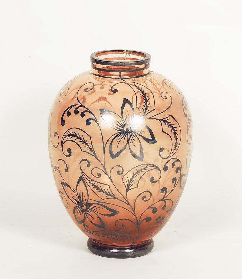 VASO IN VETRO SOFFIATO COLOR AMBRA decorato in argento con motivi floreali, h...