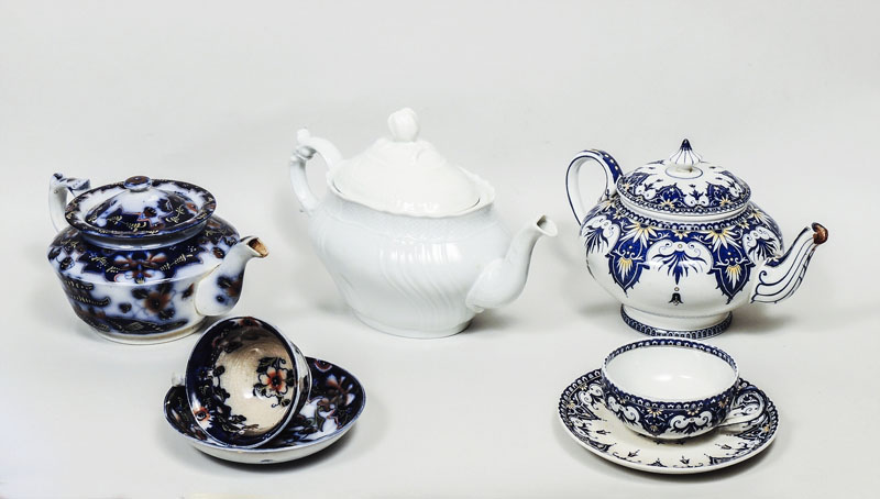LOTTO DI TAZZE DA TE una serie di 7 tazze da te in porcellana Ginori modello Massa Lombarda con teiera, una serie di 6 tazze da te in terraglia dipinte con motivi floreali nei toni del blu e del giallo con teiera e lattiera ed una coppia di tazze da te in terracotta smaltata dipinte con cineserie con teiera e zuccheriera, difetti e mancanze (20) PORCELAIN AND POTTERY TEA CUPS