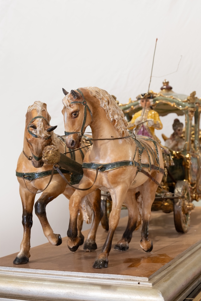 Lotto 118 | Luigi Fabris (Bassano del Grappa, 1883 - 1952) Grande scultura in porcellana policroma raffigurante Dama in una carrozza, cocchiere e due cavalli. cm 102x32x38; dimensioni della base lignea dorata cm 110x34,5
